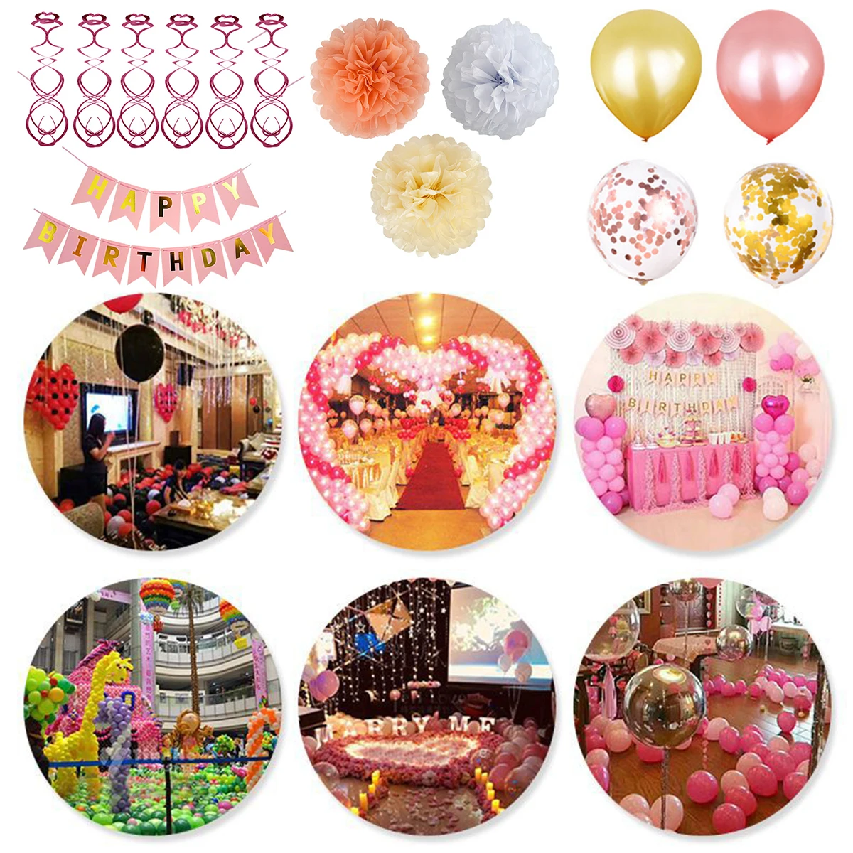 Посылка входит-баннер на день рождения x1, 12 "латексные шары x10, 12" шары с блестками x10, 8 "бумажный цветочный шар x6, 2 упаковки завитков, лента x1 и лист клея в горошек.