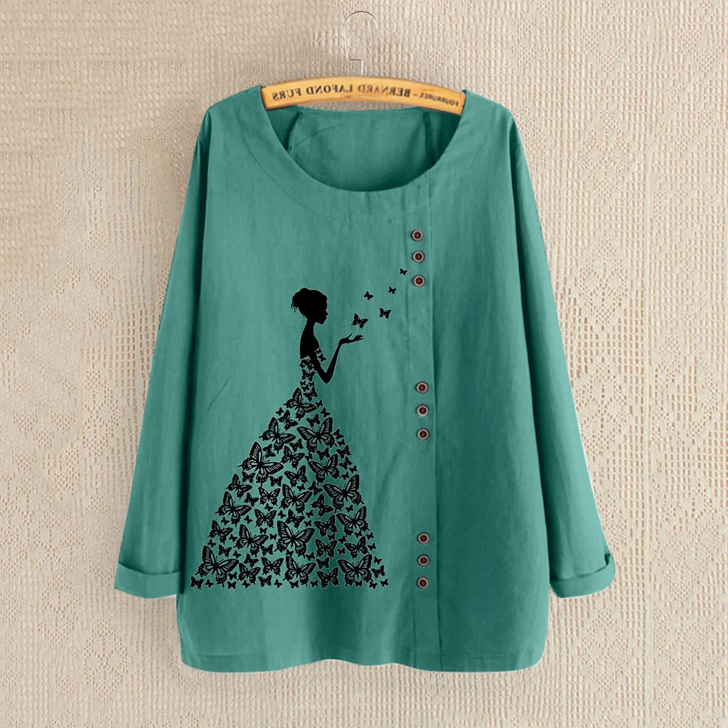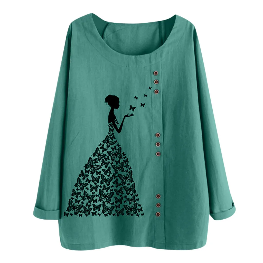 Женская блузка с длинным рукавом из хлопка и льна с круглым вырезом и цветочным принтом размера плюс