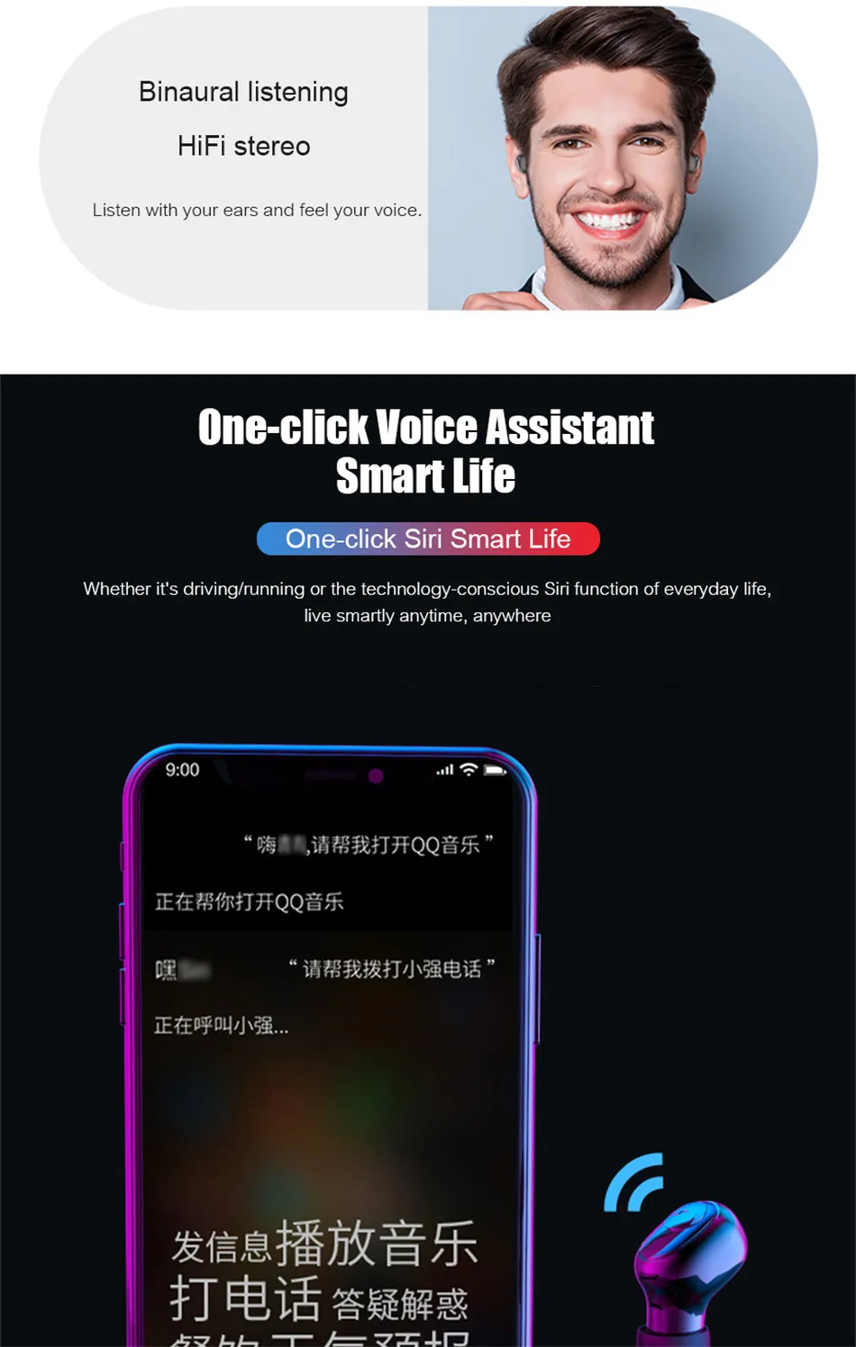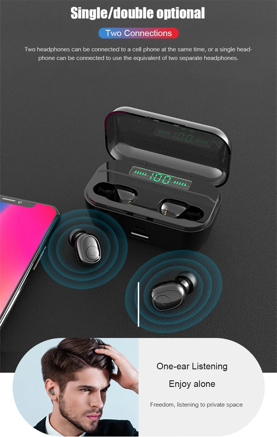 3 предмета 1% OFF 3 предмета 1% OFF 3 предмета 1% OFF Уважаемые покупатели, обратите внимание Наш магазин поддерживает дропшиппинг, если у вас есть какие-либо проблемы, пожалуйста, сообщите нам, мы сделаем все возможное, чтобы помочь вам Приятного сотрудничества! С уважением Следуя за нашим магазином, вы можете получить дополнительную 1% скидку на каждый продукт, который вы покупаете! Добавьте в список желаний или корзину, мы отправим Ваш заказ сначала после оплаты! Характеристики -Беспроводные bluetooth-наушники, обеспечивают высокое качество прослушивания звука с четкостью, и плавный отклик баса для удовольствия от всех стилей музыки. -Легкий и отлично подходит для занятий спортом, прогулок, бега или любимой деятельности. -Bluetooth 5,0, энергосбережение, улучшенная передача данных и меньше помех. -- Долговечный перезаряжаемый аккумулятор, до 4-6 часов воспроизведения времени и супер долгое время ожидания. -Встроенный микрофон позволяет этим наушникам играть в качестве гарнитуры для громкой связи с мобильными устройствами. Описание: Производительность: гарнитура TWS Bluetooth 5,0 Особенности: Поддержка беспроводной зарядки светодиодный цифровой дисплей питания может сделать мобильную мощность для зарядки мобильного телефона Применимые модели: подходят для всех мобильных телефонов и смарт-устройств с функцией Bluetooth Режим протокола: A2DP, AVRCP, HSP, HFP Эффективное расстояние: 10 м (доступно) Диаметр рога: 8 мм Сопротивление: 32 Ом Чувствительность: 42db Искажение: ± 5% Емкость аккумулятора: наушники 55 мАч, зарядный Корпус: 3500 мАч Время воспроизведения музыки в наушниках: 4-6 часов (в зависимости от громкости) Время разговора на наушниках: 3-5 часов (в зависимости от громкости) Время зарядки наушников: 1 час Интерфейс зарядки батарейного отсека: micro USB Выход USB: 5 V 1A Вес одного уха: 3 г Размер изделия: наушники 1,5*2,5*1,8 см; батарейный отсек 8*4,3*3,5 см Упаковочный лист: 2X Bluetooth гарнитура, 1X батарейный отсек 1X USB кабель, 1X руководство на китайском и английском языках, 4X чехол для наушников