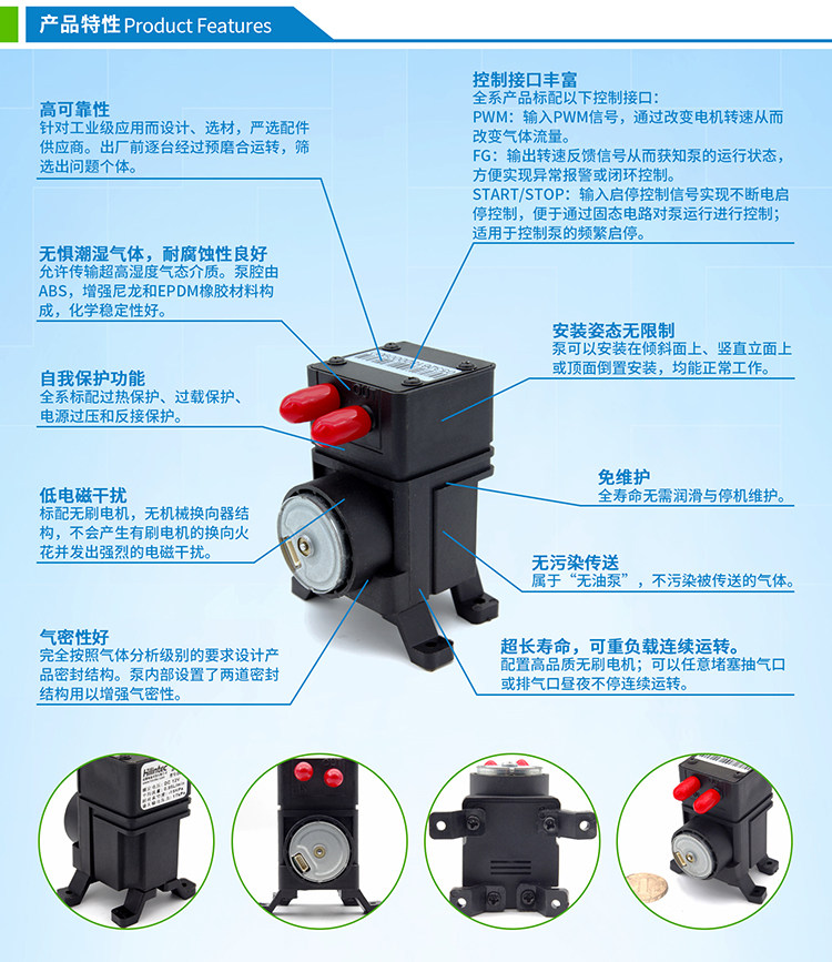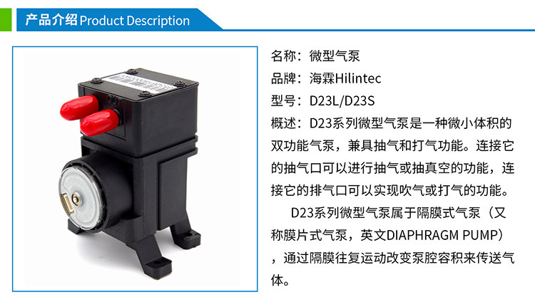 Воздушный микронасос серии D23 Основные области применения: анализ газа, экологические испытания, лазерное оборудование, биохимическое медицинское, испытательное оборудование... Он особенно подходит для тех случаев, когда место установки ограничено, надежность высокая, шум низкий, и скорость потока не превышает 1Л/мин.