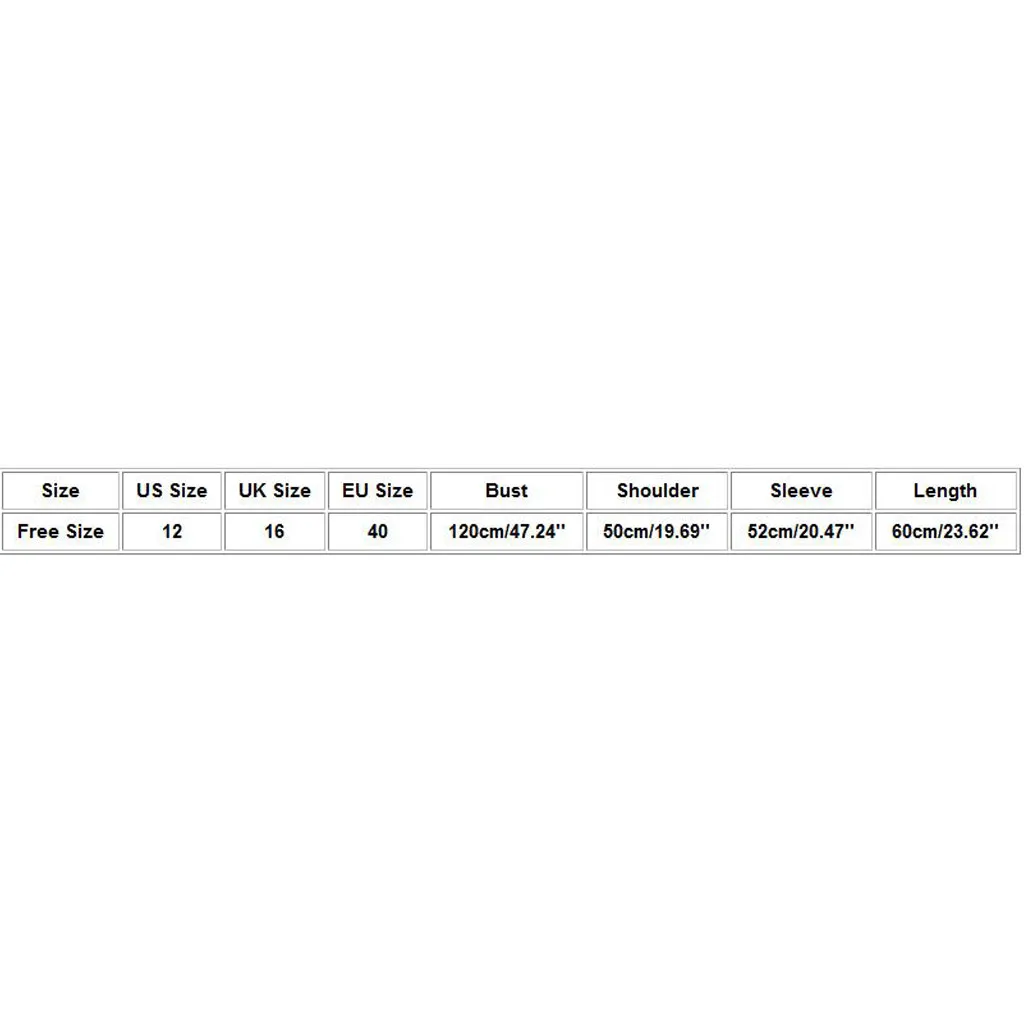 | Размеры: Бесплатные Размеры | Нам Размеры: 12 | UK Размеры: 16 | ЕС Размеры: 40 | Бюст: 120 см/47,24 дюйма | Плечо: 50 см/19,69 дюйма | Рукав: 52 см/20,47 дюйма | Длина: 60 см/23,62 дюйма |