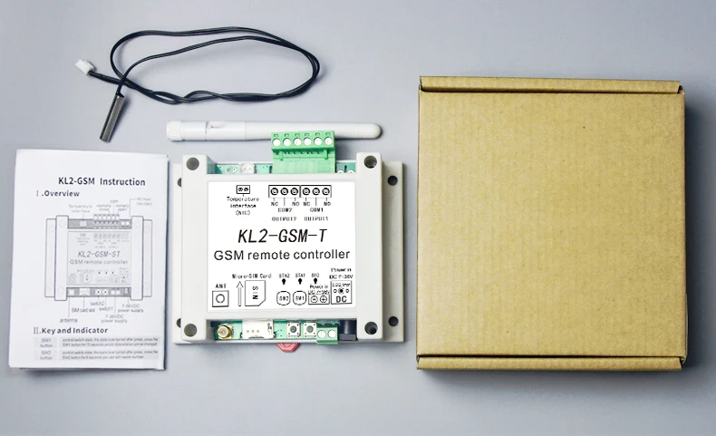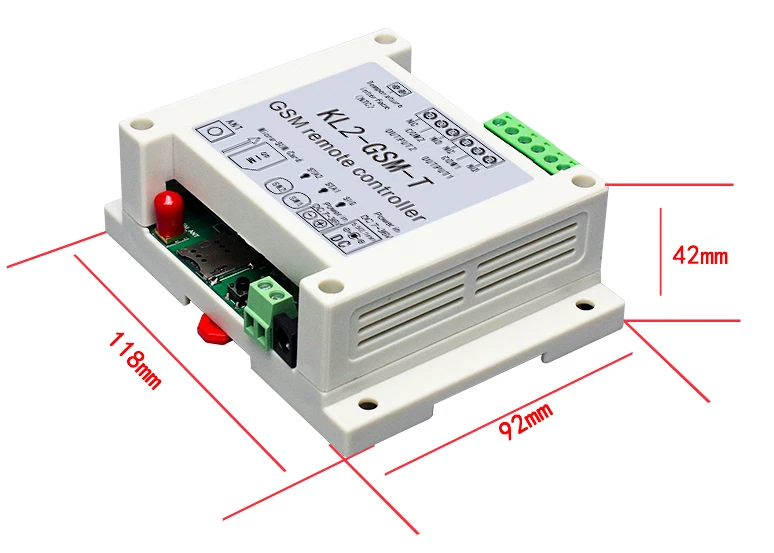 KL2-GSM-T: Не поддерживайте оповещение о тревоге, когда температура достигает верхнего предела; Не поддерживайте сигнал тревоги о сбое питания.KL2-GSM-TC: сигнал тревоги, когда температура достигает верхнего предела;Поддержка сигнала тревоги о сбое питания. KL2-GSM-T пульт дистанционного управления Обзор продукта:KL2-GSM-T-это GSM продукт, который поддерживает два выхода 10А, 1 Обнаружение температуры и 6 групп контроля температуры. Возьмите «пульт дистанционного управления» в качестве основной функции и имеют высокую удобство использования. Пользователь может легко и быстро интегрировать KL2-GSM-T в собственную систему для реализации дистанционного управления, который основан на сети GSM. Основные особенности:1. Может работать из любого места, без ограничения расстояния2. Четырехдиапазонный 850/900/1800/1900 МГц GSM модуль внутри3. Широкий диапазон питания 7 ~ 36 В постоянного тока4. 2 выхода реле (10A/30VDC, 10A/250VAC)5. 1 сенсор комнатной температуры вход для мониторинга температуры на месте6. 6 групп автоматического контроля температуры может быть установлен SMS7. До 10 авторизованных номеров могут включать/выключать устройство с помощью бесплатного звонка8. Дизайн промышленного класса подходит для длительной работы;9. L118 * W92 * h42мм, совместимый настенный монтаж и DIN35mm промышленная железнодорожная установка. Спецификация:Источник питания постоянного тока: Стандартный адаптер 12В/500мА диапазон 7-36в постоянного токаПотребляемая мощность: в режиме ожидания 12 В/50 мА, максимальная Рабочая мощность 12 В/200 мАЧастота GSM: 850/900/1800/1900 МГцИнтерфейс sim-карты: поддержка микро sim-карты 3 вВнешняя антенна: SMA Антенный интерфейс, 50 ом, усиление 3 дБТемпературные интерфейсы: 1 NTC температурный портДиапазон обнаружения температуры: от-40 до + 110 градусовРелейные выходы: 2 канала, 10A/30VDC 10A/250VACЛогика вывода: нормально открытый и нормально закрытыйВнешние размеры: 118x92x42ммРазмер коробки: 135x142x43ммВес нетто: 150 гВес брутто: 190 г![]()