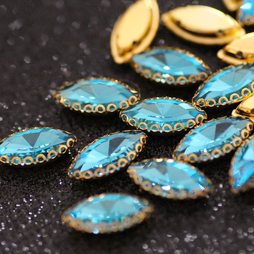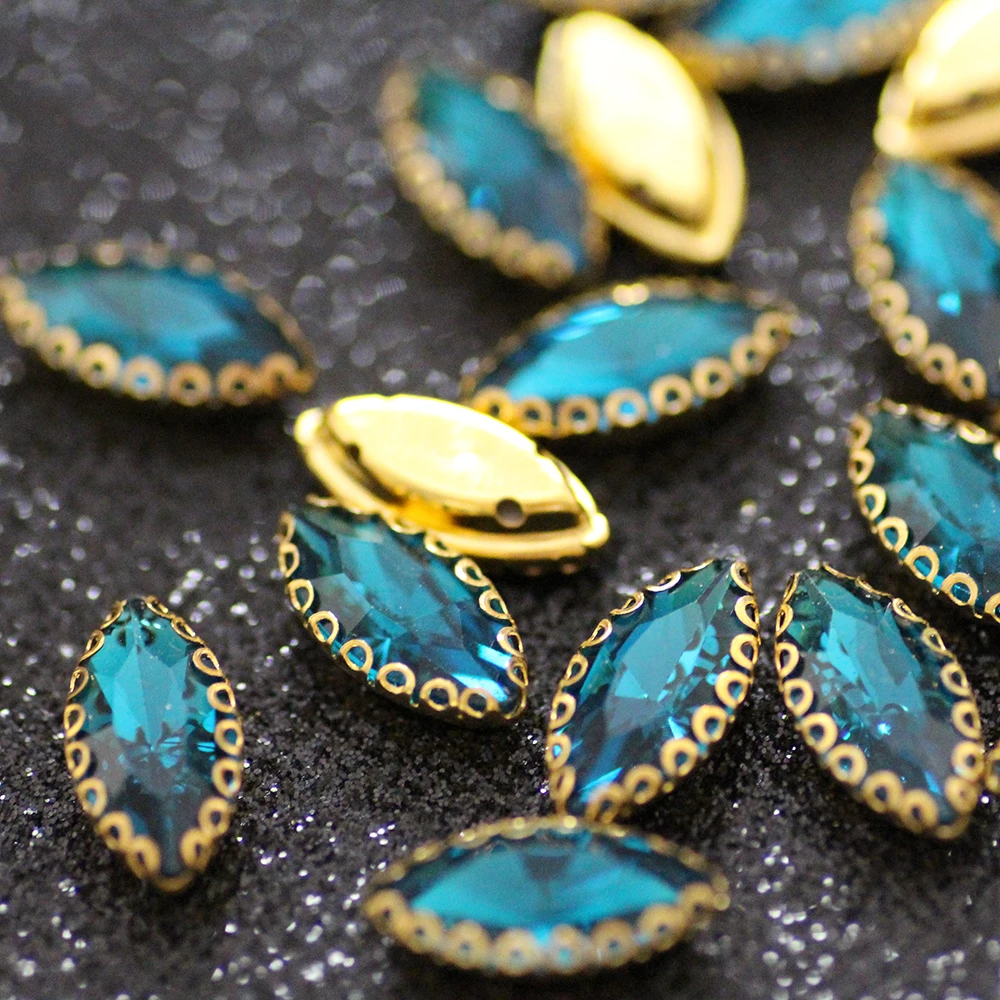Пришить горный хрусталь с золотой основой Материал; стеклянные стразы + металлические элементы Размер: около 7x15 мм Упаковка: 10 шт., смешанный цвет мы отправим его случайным образом На основе есть отверстия, вы можете сшить их на ткани.