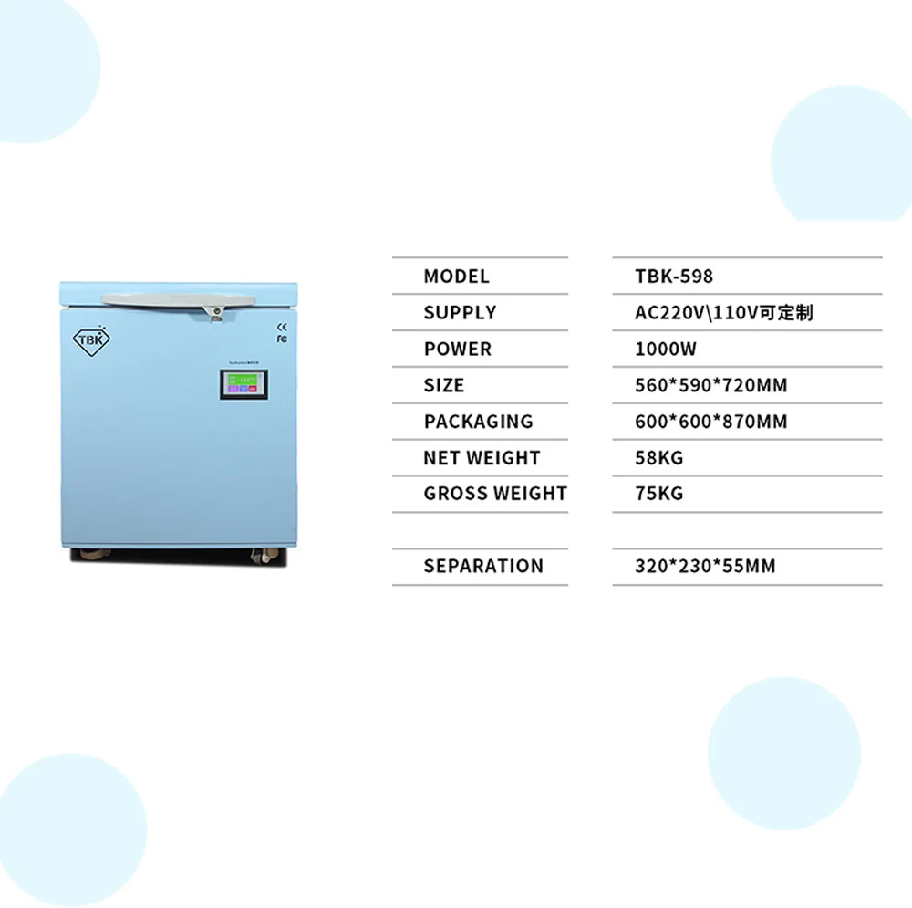 Параметры: Модель: TBK-598 Напряжение: 110 В/220 В Температура:-180 °C Мощность: 1000W Размер машины: 560*590*720 мм Размер охлаждения: 225*320 мм