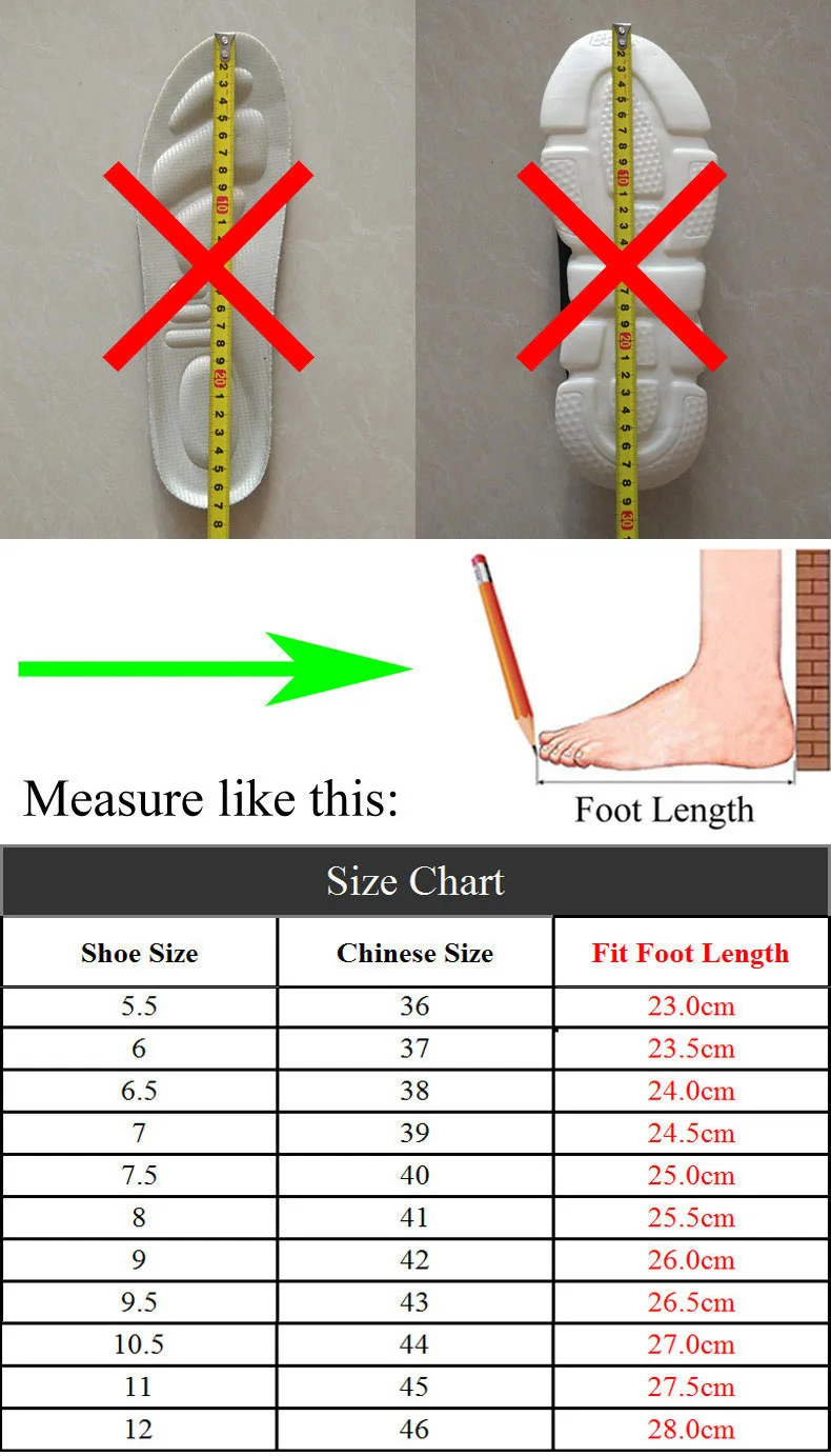 1. Китайский размер обуви отличается от вашей страны, в Китае, только длина стопы позволяет выбрать правильный размер обуви. 2. Не измеряйте длину обуви, не измеряйте длину стельки. 3. Зная точную длину вашей стопы, выберите размер из нашей таблицы размеров, если ваша стопа широкая или толстая, чем обычно, на один размер больше. 4. После того, как мы отправим вашу обувь, пожалуйста, не забудьте отследить вашу посылку и забрать ее вовремя, или она будет уничтожена, если с течением времени. 5. Если у вас есть какие-либо вопросы, пожалуйста, свяжитесь с нами, мы хотели бы помочь вам.