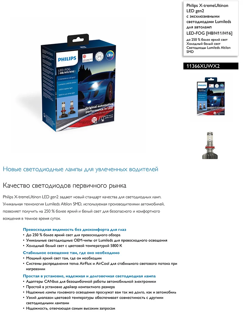 | Уникальные светодиодные OEM-чипы от Lumileds для превосходного освещения X-tremeUltinon LED gen2 — это единственная усовершенствованная светодиодная лампа для послепродажной установки, в которой используются светодиодные OEM-чипы (от производителей комплектующих для первичного рынка) — Lumileds LUXEON Altilon SMD. Превосходное освещение достигается в том числе и благодаря идеальной форме светового луча. Это означает, что луч освещает необходимые участки дороги, не ослепляя других водителей, что повышает безопасность поездки в ночное время суток. Одной из причин выбора светодиодных чипов Lumileds и ламп Philips для автомобильных фар крупнейшими производителями автомобилей в мире является высочайшее качество компонентов с передовыми характеристиками. |