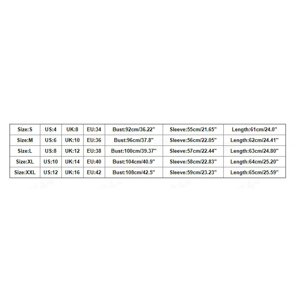 Размеры: S Свяжитесь с нами: 4 UK: 8 ЕС: 34 Бюст: 92 см/36,22 дюйма Рукав: 55 см/21,65'' Длина: 61 см/24,0 дюйма Размеры: М Свяжитесь с нами: 6 UK: 10 ЕС: 36 Бюст: 96 см/37,8" Рукав: 56 см/22,05 дюйма Длина: 62 см/24,41'' Размеры: L Свяжитесь с нами: 8 UK: 12 ЕС: 38 Бюст: 100 см/39,37 дюйма Рукав: 57 см/22,44 дюйма Длина: 63 см/24,80 дюйма Размеры: XL Свяжитесь с нами: 10 UK: 14 ЕС: 40 Бюст: 104 см/40,9" Рукав: 58 см/22,83 дюйма Длина: 64 см/25,20 дюйма Размеры: XXL Свяжитесь с нами: 12 Великобритания: 16 ЕС: 42 Обхват груди: 108 см/42,5" Рукав: 59 см/23,23 дюйма Длина: 65 см/25,59 дюйма