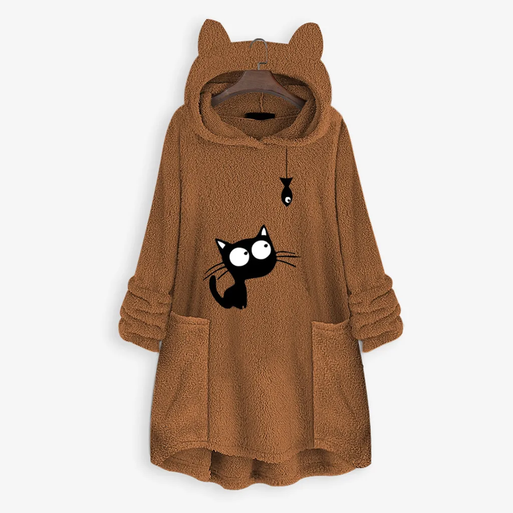 Женская флисовая вышивка кошачьими ушками размера плюс толстовка с карманом Топ свитер блузка