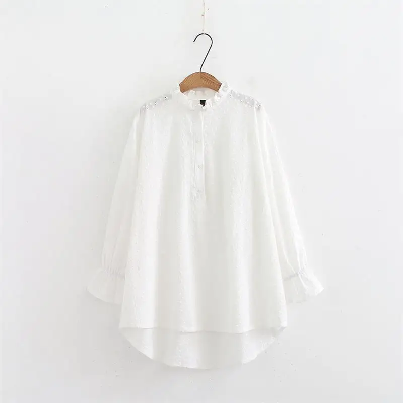 Plus size ruches Kraag vrouwen kleding Lente & herfst vrouwen tops en blouses Geborduurde witte lange mouwen katoenen shirtONS $15.59 /Stuk
