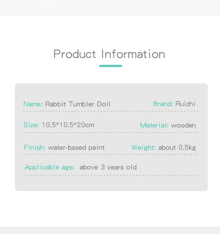 Кролика стакан куклы Развивающие игрушки для детей Информация о продукте Бренд: ruizhi Название: кукла-неваляшка с кроликом Материал: дерево Вес: около 0,5 кг Размеры: 10,5*10,5*20 см Отделка: краска на водной основе Применимый возраст: свыше 3 лет Характеристики продукта Функция 1. Воображение 2. Связь навыки 3. Координацию рук и глаз 4. Цвет осведомленности Подробная информация о продукте Безопасный материал Выберите высококачественную древесину, цельную древесину для сборки, не легко играть плохо Изысканный и гладкий Гладкая полировка, без заусенцев, без вреда для рук ребенка Технология термопечати с высокой температурой Изысканная технология, Защита окружающей среды, отсутствие запаха, безопасность и гарантия