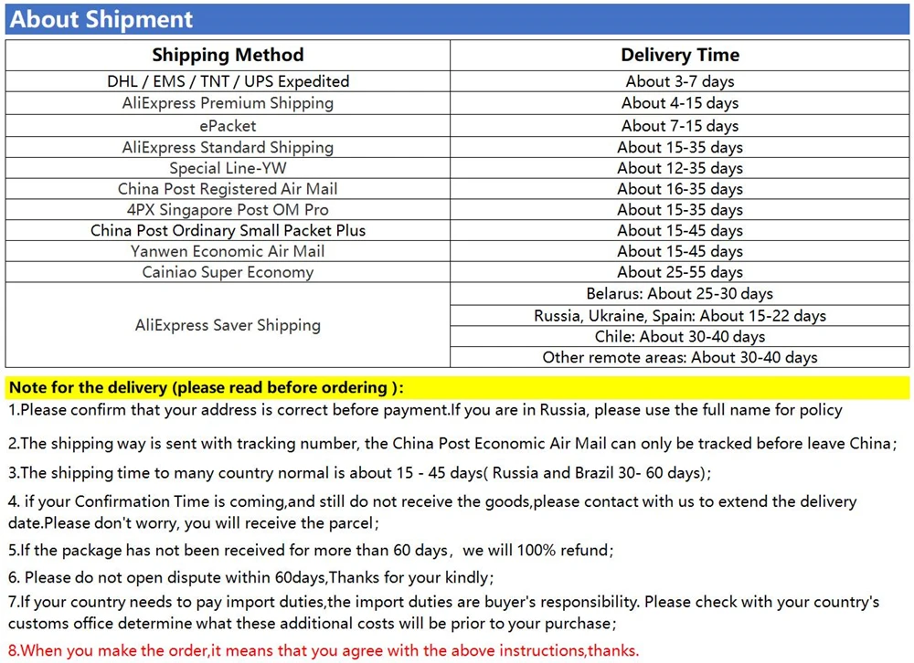 3. Время доставки зависит от разных стран и регионов. Большинство стран прибывают в течение 15-45 дней, но из-за различных факторов иногда это может быть задержано до 60 дней. Пожалуйста, не решайте спор в течение 60 дней. После 60 дней, вы все еще не получили товар, пожалуйста, свяжитесь с нами, чтобы решить.