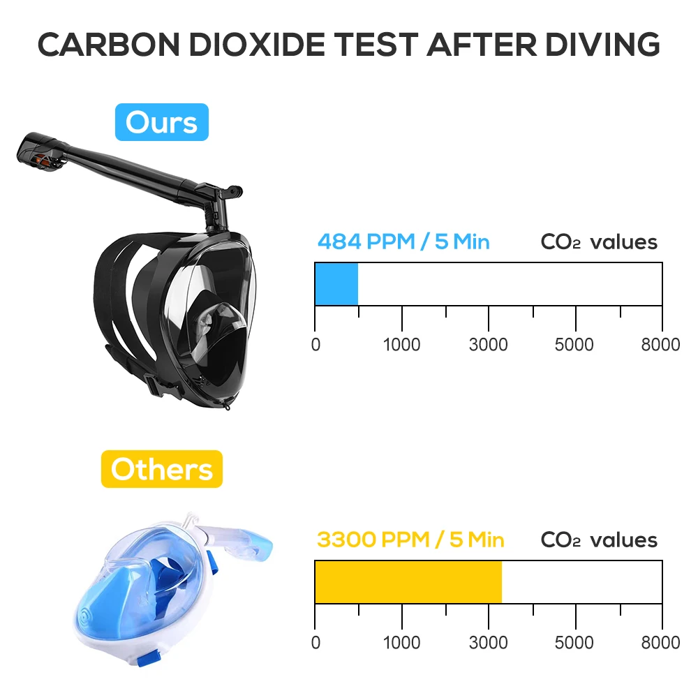 Отделенные дыхательные каналы, вдох из трубки и выдох из боковых вентиляционных отверстий, поэтому O2 и CO2 не будут смешиваться в трубке, что делает каждое дыхание свежим и предотвращает запотевание. Кроме того, трубка на 2-3 дюйма длиннее, чем старая версия, чтобы предотвратить попадание волны, И он поворачивается на 360 °, что позволяет регулировать различные углы для различных осанки плавания, таких как sidesroke и backstroke.