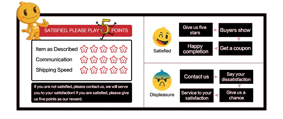 Если вы не удовлетворены товарами, пожалуйста, не стесняйтесь, свяжитесь со мной, чтобы получить решение вместо того, чтобы оставлять нейтральные или негативные отзывы, мы постараемся сделать все от нас зависящее, чтобы решить проблему. Пожалуйста, оставьте положительный отзывы и 5 звезд, если вы удовлетворены нашими товарами и услугами. :) Спасибо