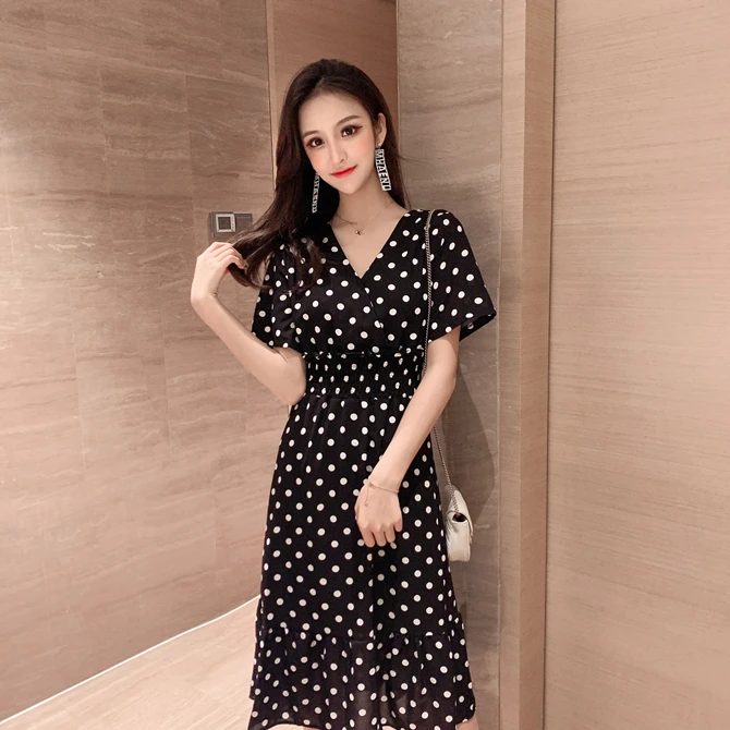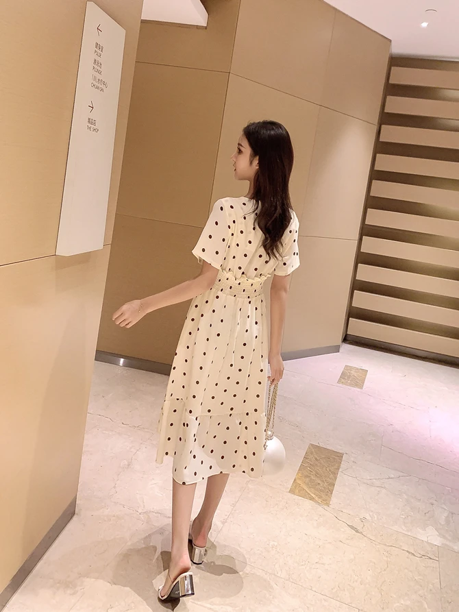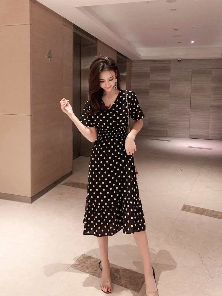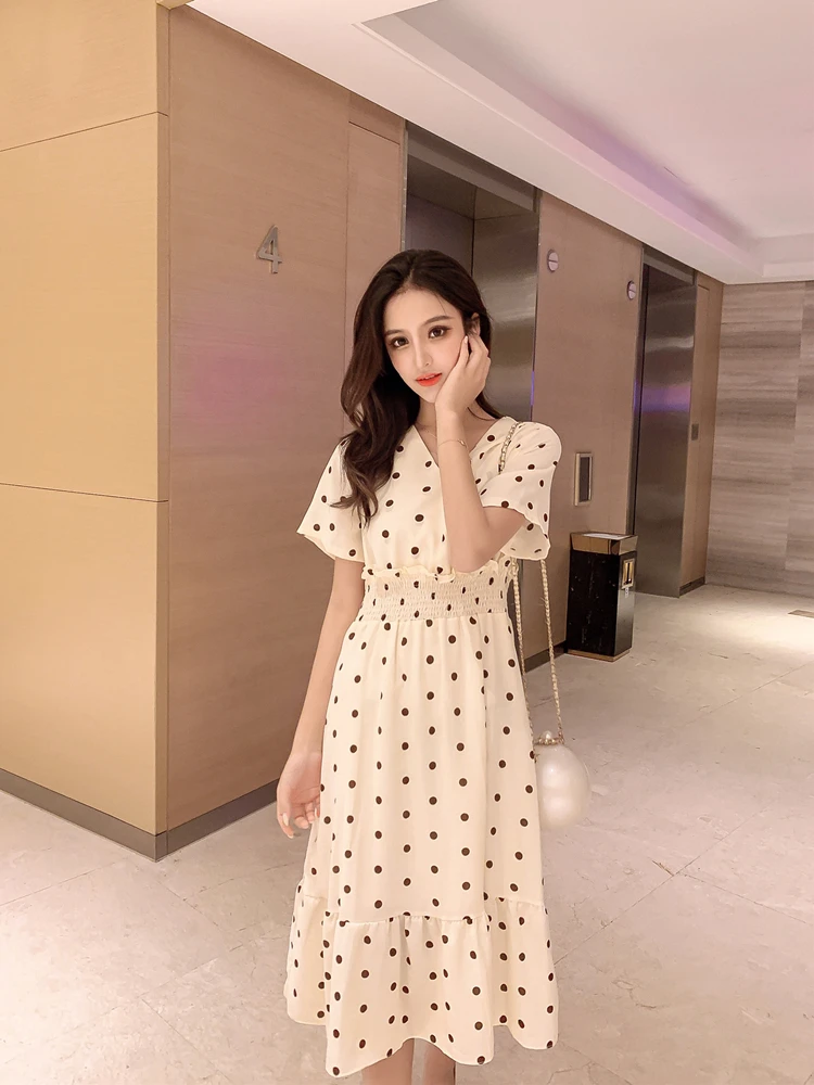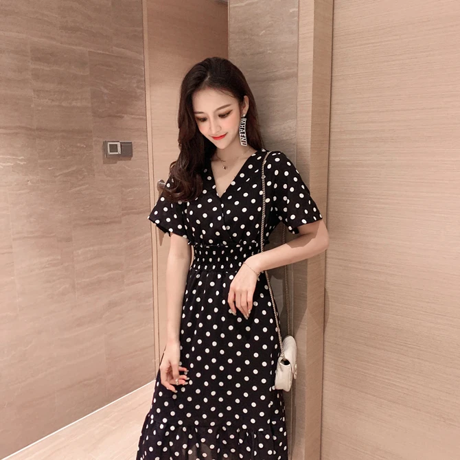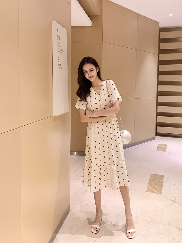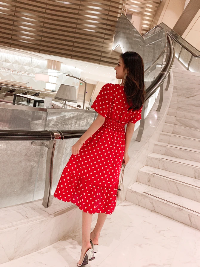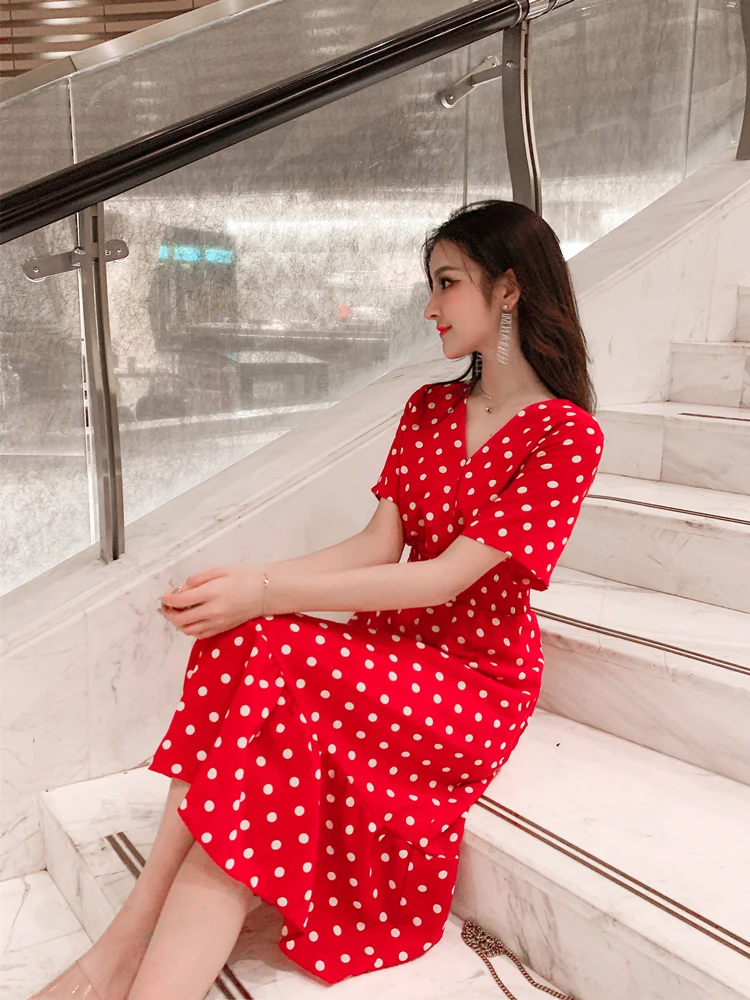 Summer Women Midi Dress V Neck Polka Dot High Waist Mujer Vestidos Apricot Black Red Ruffles Chiffon Elegant Dress AE768
