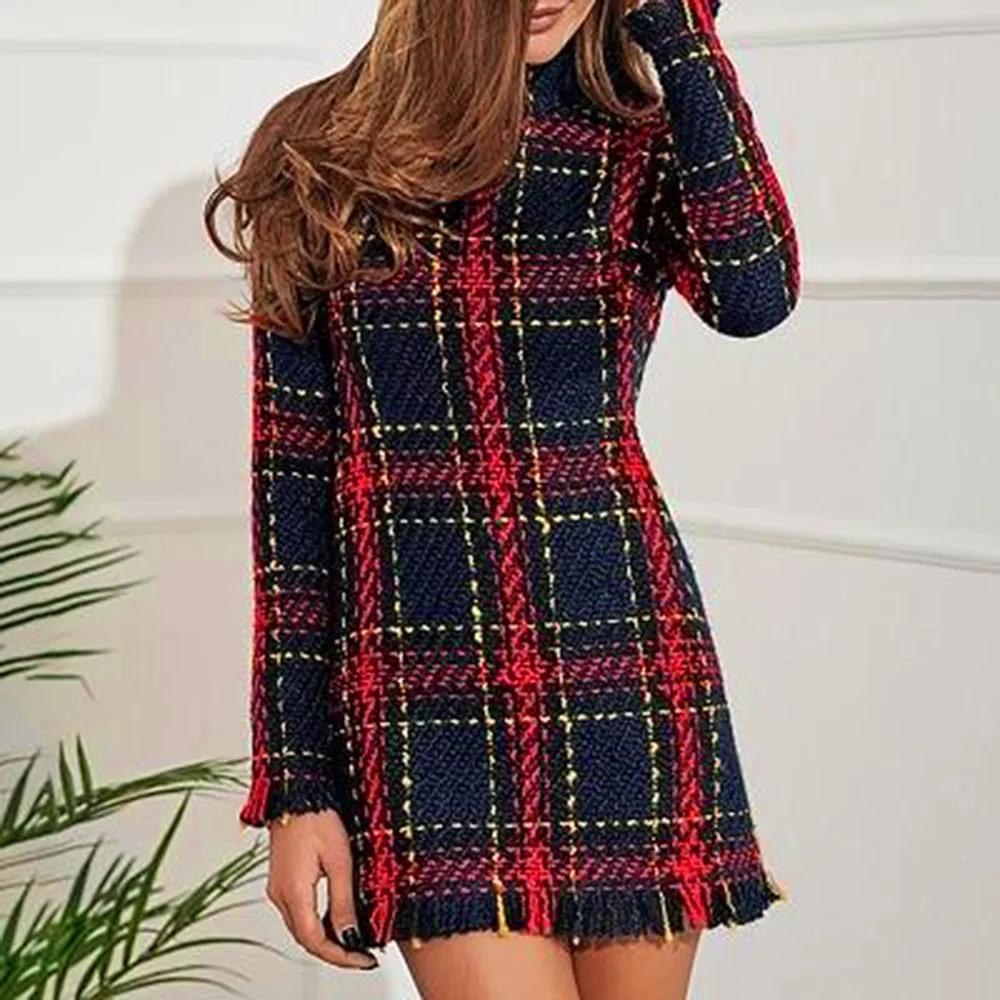 Для женщин в клетку Свитер с высокой талией облегающее платье с длинным рукавом мини-платья