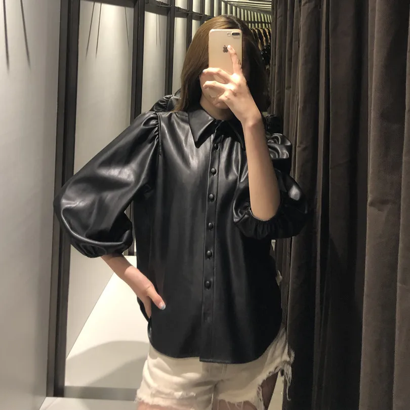 Черная Женская блузка из искусственной кожи с рукавами-фонариками и пуговицами, зимняя женская блузка с рукавами-фонариками из искусственной кожи, 2020