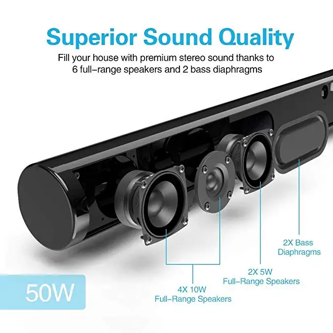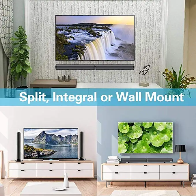 50 Вт Мощные звуковые панели bluetooth 4,2 оснащены полнодиапазонными динамиками 4*10 Вт и 2*5 Вт и 2 басовыми диафрагмами для обеспечения четкого превосходного стереонаушника, заполняющего комнату. Вы можете наслаждаться фильмами, музыкой, телевизионными шоу, новости и игры. Это приносит вам обновленный фантастический домашний кинотеатр с объемным звуком. Съемный дизайн, 3 режима настройки-с инновационным дизайном, легко отделить и комбинировать. Разделите на 2 колонки в башне, столешницу и настенное крепление, эти 3 способа позволяют установить bluetooth-динамик в 2 башенных spkeaker или эхолота под телевизором или установить его на стену для удобной и элегантной настройки. В любом случае будет звучать звук, который раскалывает дом. Проводное и беспроводное соединение, легко установить-ваш смарт-телевизор, компьютер ноутбук, iPhone, iPad, iPod, Echo Dot, смартфон, планшет и любые умные устройства могут работать с этой домашней аудиоколонкой благодаря Bluetooth 4,2 (эффективное расстояние: 33 фута/10 метров) плюс, он может поддерживать AUX, RCA, Оптический, HDMI, внешний сабвуфер. Лучший Саундбар для ТВ/проектора/ПК/dvd-плеера/PS4/MP4/MP3/CD-плееров. Кнопки или пульт дистанционного управления: очень легко использовать наш Саундбар домашний аудио Bluetooth динамик через кнопку или пульт дистанционного управления. пожалуйста, обратите внимание, что вы должны использовать пульт дистанционного управления или кнопку на саундбаре, чтобы изменить громкость, когда Саундбар подключен к телевизору. Светодиодный светильник-индикатор, сияющий разными цветами, означает различные режимы работы, которые позволяют удобно подключаться к различным устройствам. Разнообразие аксессуаров, удовлетворяет все ваши потребности: этот саундбар bluetooth-динамик поставляется со всеми видами соединительных кабелей, включая кабель HDMI 1,5 м, оптический кабель, аудиокабель AUX, кабель RCA.