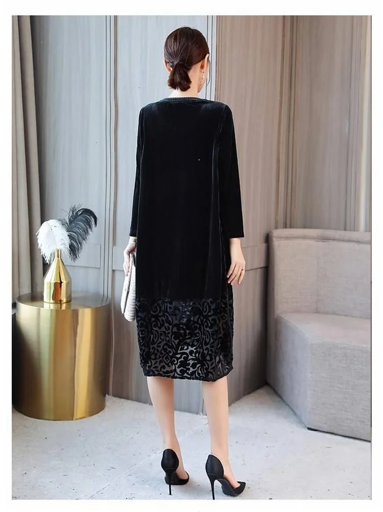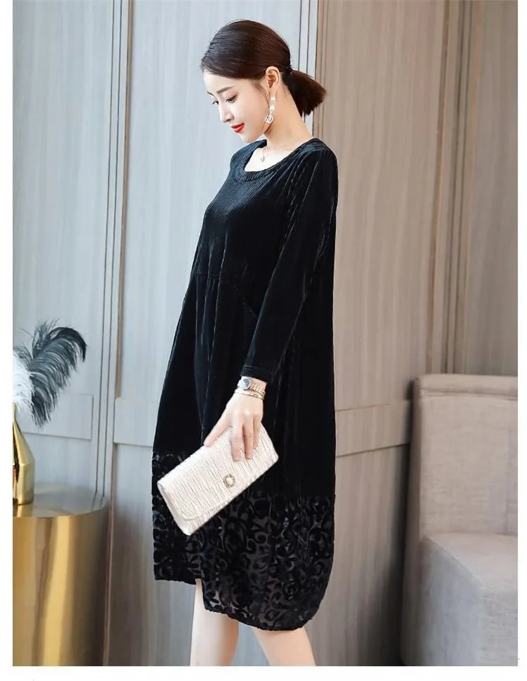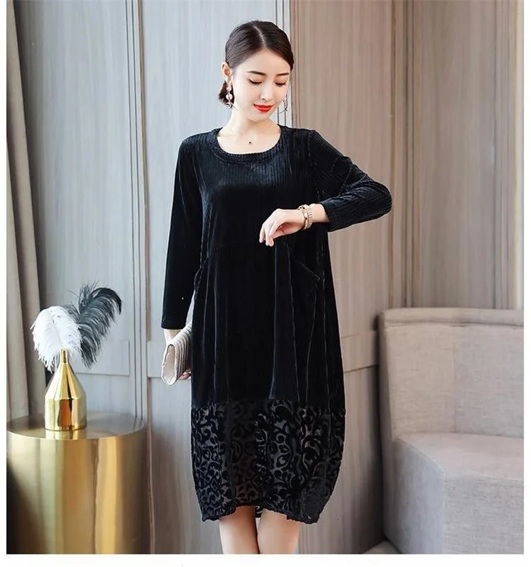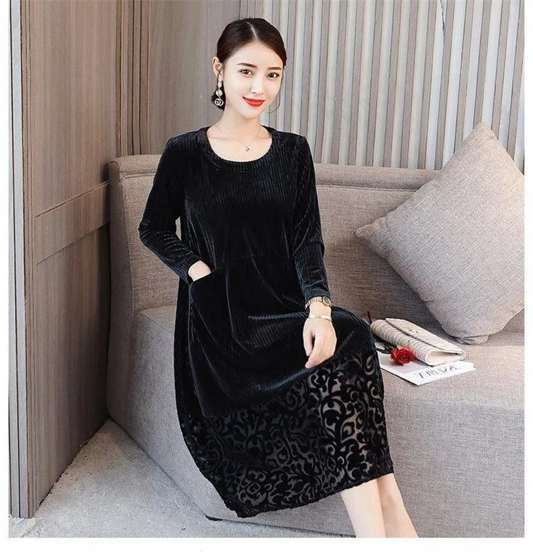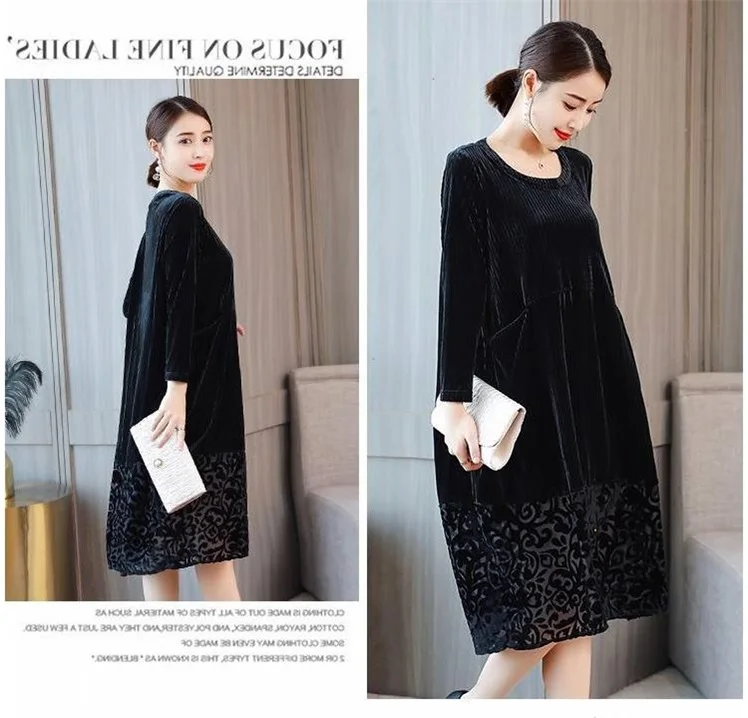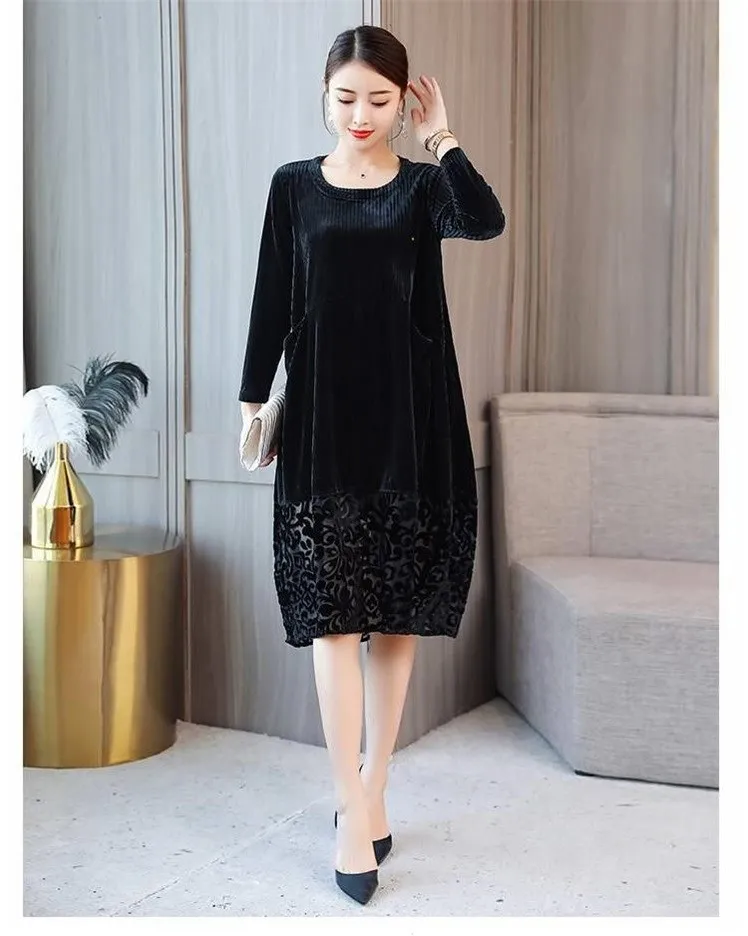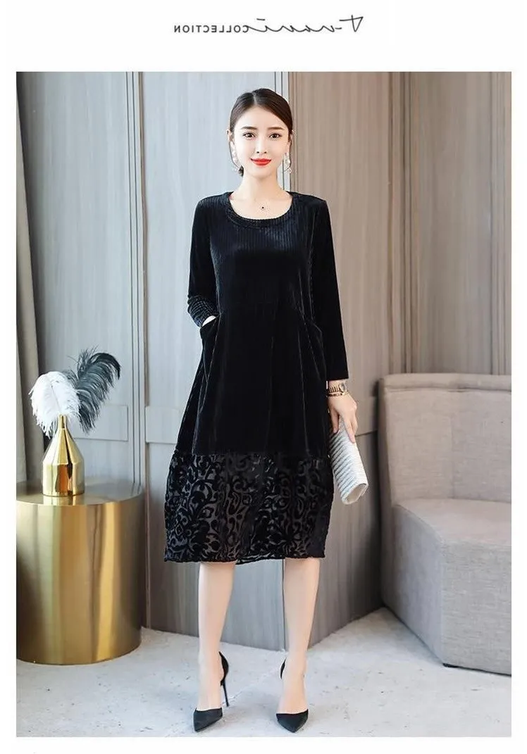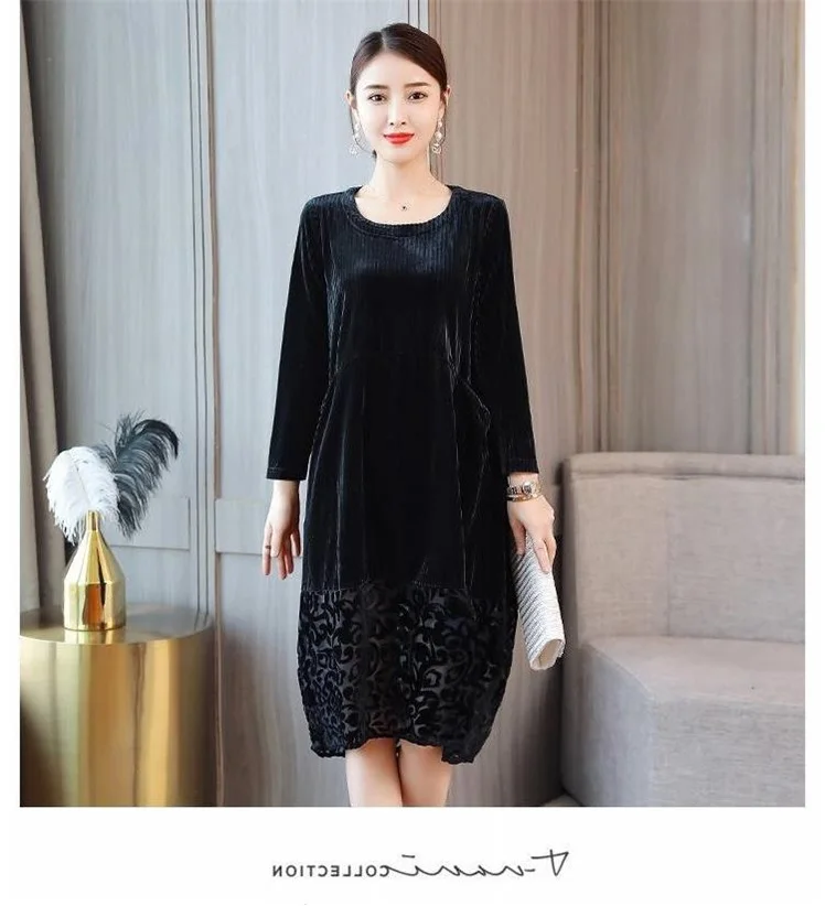 black plus size velvet autumn dress 2020 new long sleeve lace patchwork loose corduroy temperament winter dresses women AQ380