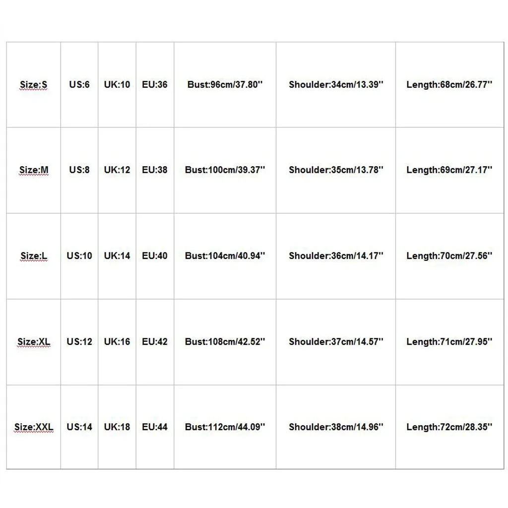 | Size | US | UK | EU | Bust | Shoulder | Length |