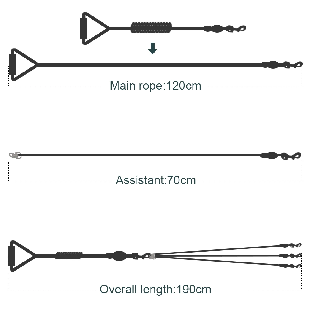 Общая Длина поводка: 190 см Длина основного каната: 120 см Длина вспомогательной веревки: 70 см