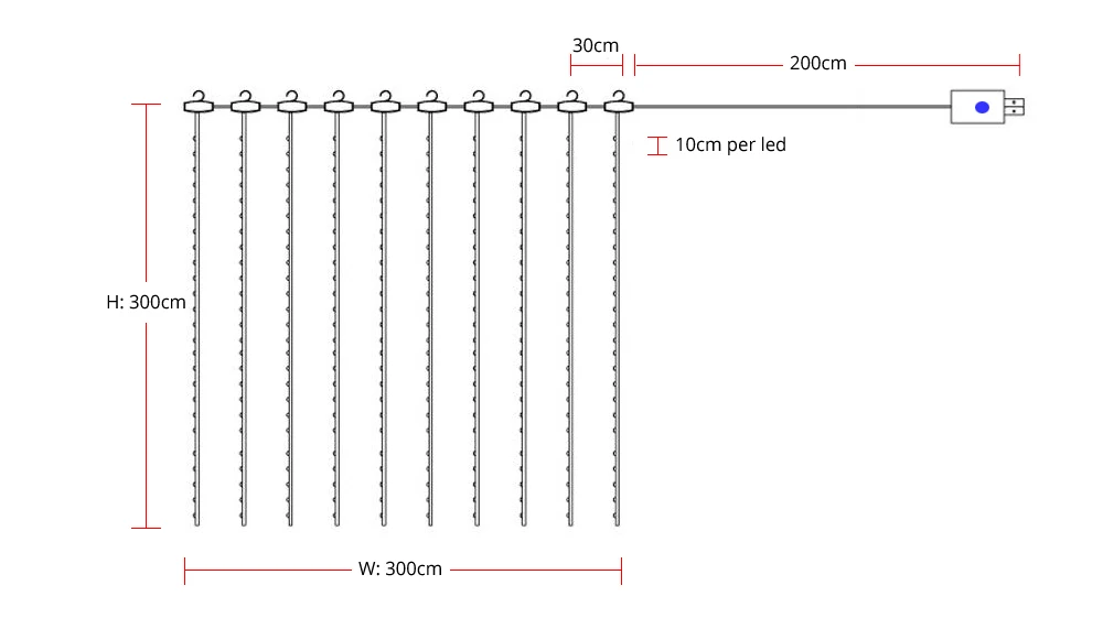 Размеры: Ширина: 3 м/118 дюйма/футов Высота: 3 м/118 дюйма/футов В общей сложности 300 led