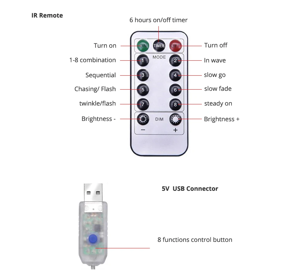ИК Rmote Функция: 1. 1-8 комбинация; 2. в волне; 3. последовательного; 4. медленный ход; 5. чеканка/вспышка; 6. медленное выцветание; 7. мерцание/вспышка; 8. постоянное горение