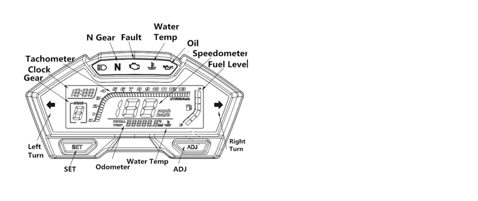 5) часы: 12-часовая система, нажмите кнопку SET, скорость транспортного средства мигает, нажмите кнопку SET один раз, часы мигают, затем нажмите кнопку SET в ближайшее время-один раз, часы мигают. При мигании, нажмите кнопку ADJ, чтобы изменить, не работает в течение 15 секунд, автоматически выйти и принять эффект. Вы также можете нажать кнопку SET, чтобы выйти и начать действовать. 6. настройки фона: вы можете установить скорость транспортного средства, Количество цилиндров, двухпроводной/трехпроводной датчик, а затем нажмите и удерживайте кнопку набора, затем откройте дверь. ЖК-дисплей будет прыгать от 0 до 9, а затем перейти к интерфейсу настройки. По умолчанию дисплей 018 1 2. Положение, индикатор неисправности двигателя, индикатор температуры воды отрицательное управление; левый и правый сигнал поворота, дальний свет, положительный контроль.