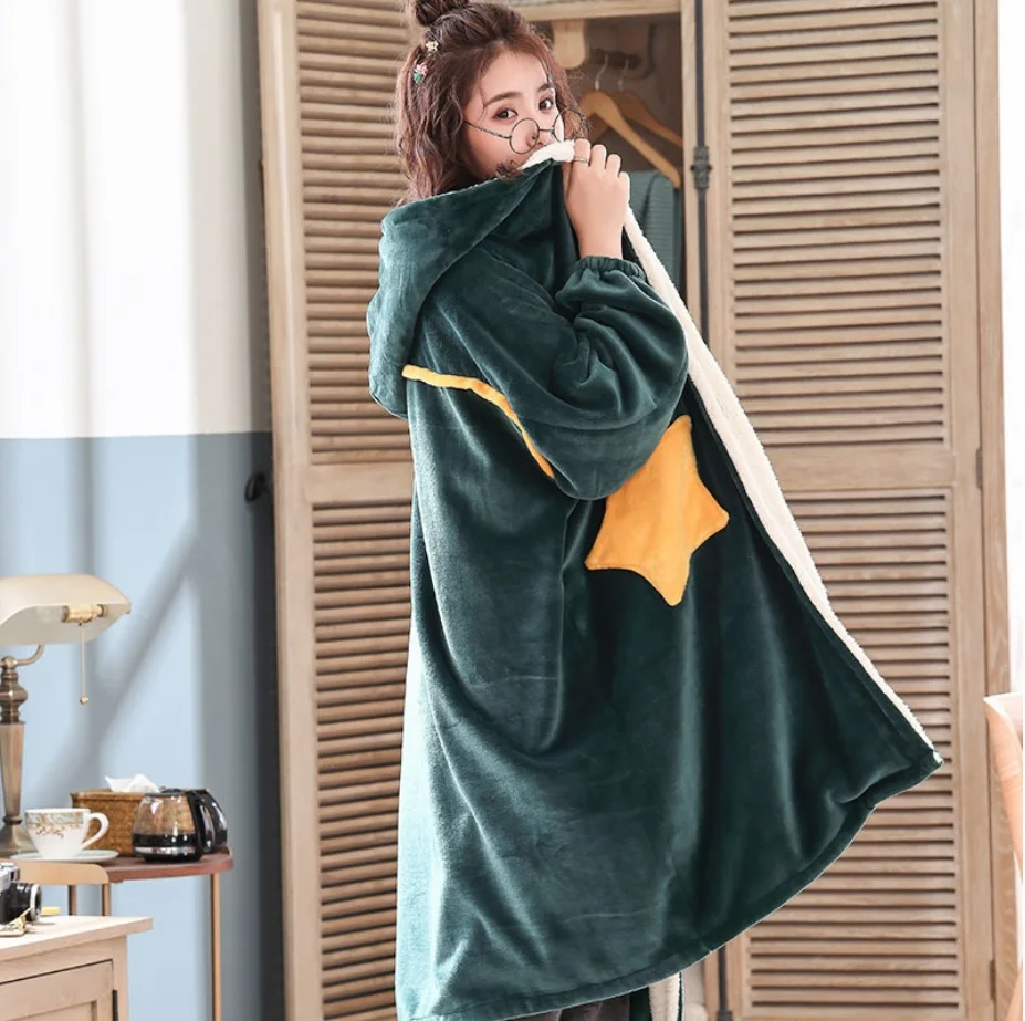 Наш ночной халат унисекс подходит для мужчин и женщин. Материал-ночная сорочка TENTEN изготовлена из 100% полиэфирной фланели с шерпой внутри. Он мягкий, толстый и теплый. Просто выберите его, вам понравится. Дизайн-Халат с капюшоном, застежка на пуговицах спереди. С каждой стороны есть две большие контрастные звезды, которые сделают вас милым. 8 цветов на выбор. Подходит для дома и повседневной носки в холодную зиму. Упаковка-1 * халат