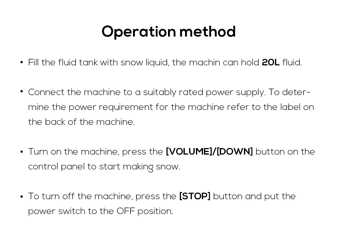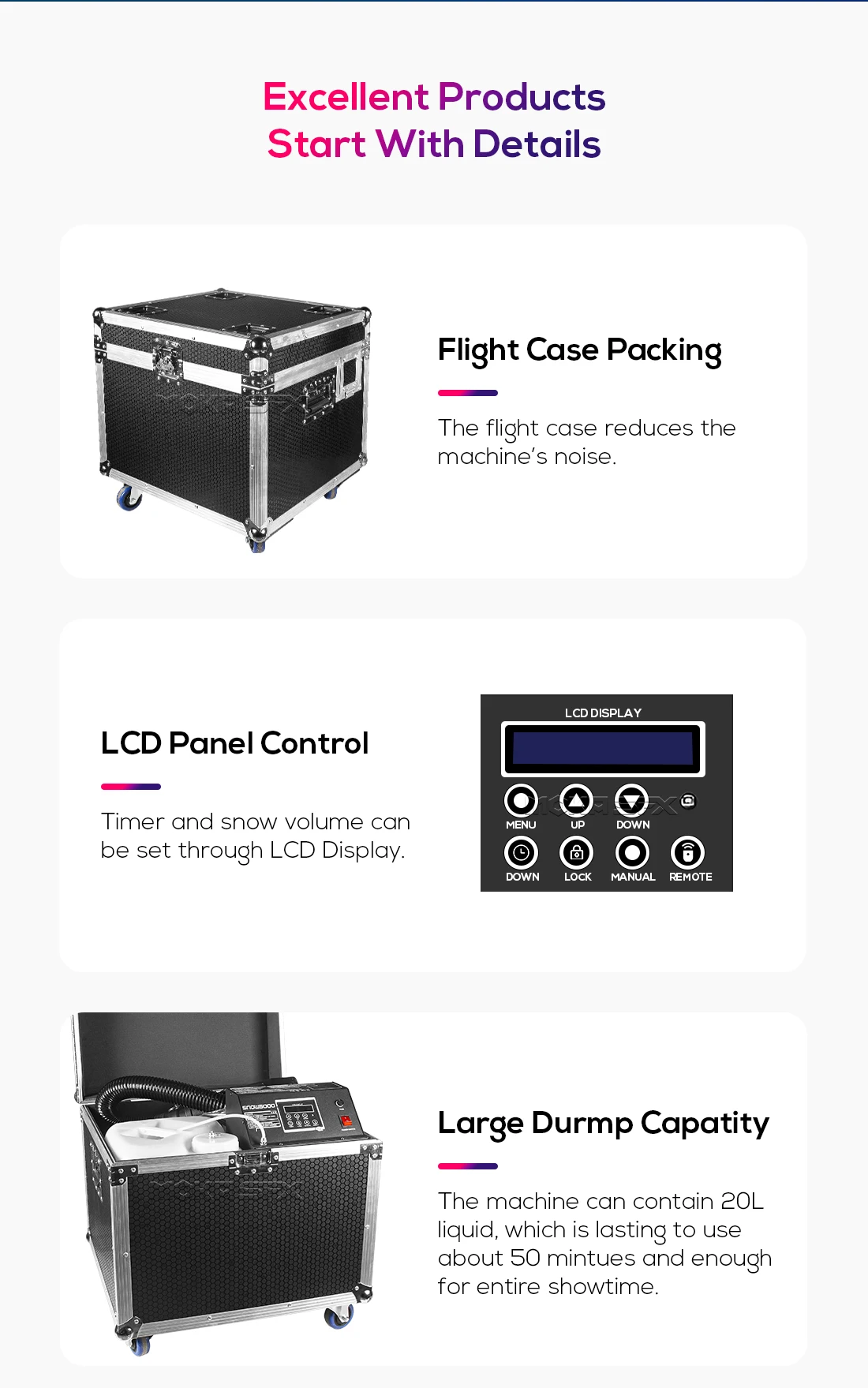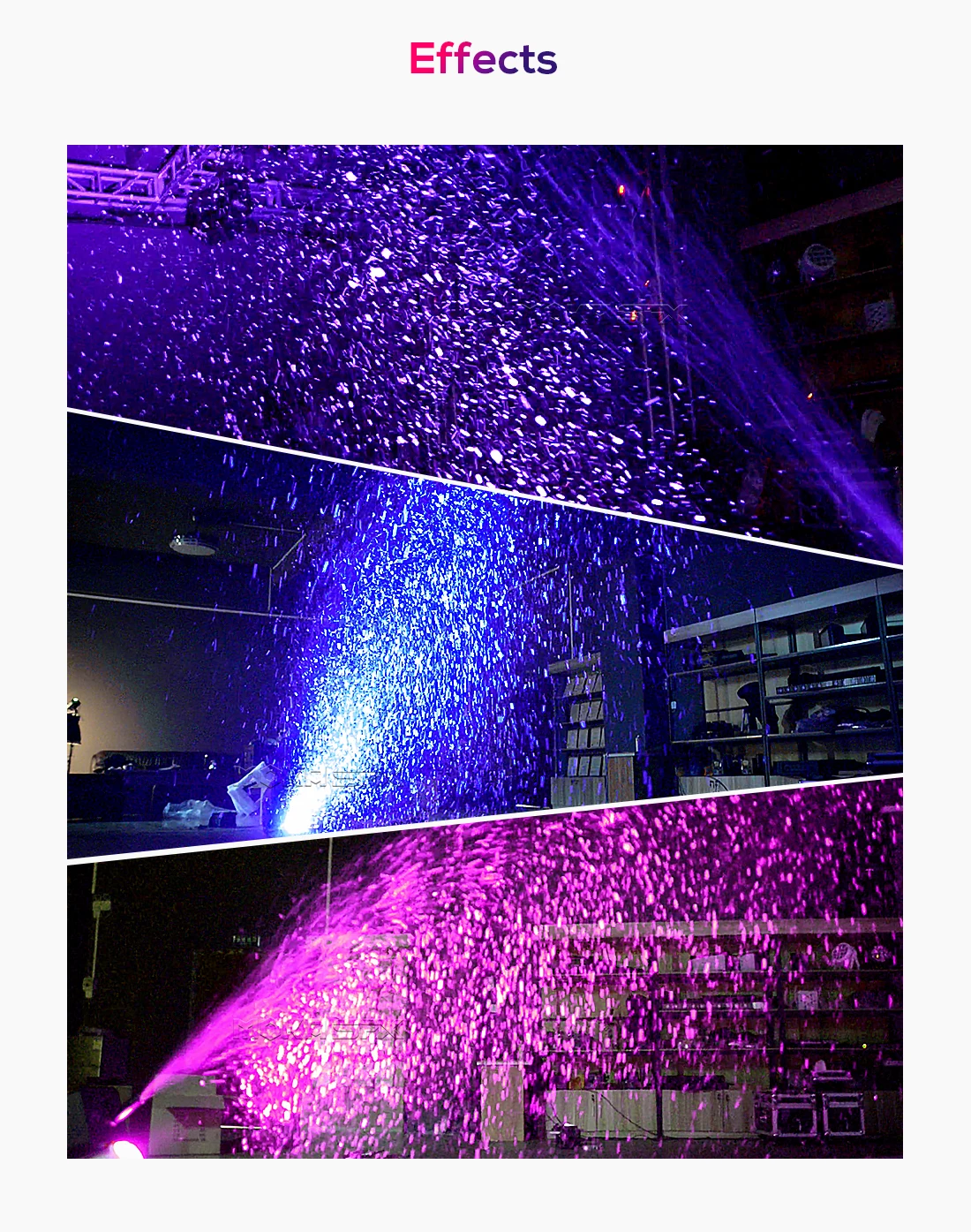 Вы можете регулировать объем воздуха и скорость потока жидкости, чтобы получить правильные эффекты снега, как вам нужно, от тонкого снега до метели.