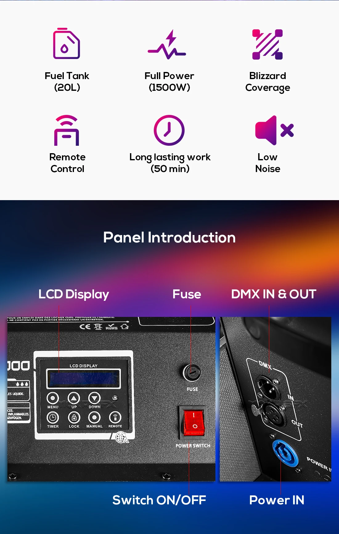 Мощность: 1500 ВтЕмкость барабана: 20 л (80 мин)Управление: Руководство/DMX512/пульт дистанционного управленияМаксимальный расход: 250 мл/мин.Регулировка громкости и скорости вентилятораВес брутто: 36,5 кгРазмер изделия: 61x56x65смРасстояние распыления: 10 мУпаковка: Встроенный flycaseТрубка: 10 метровСертификация: CE/ROHS/FCCWrooduct гарантийное время: 1 год