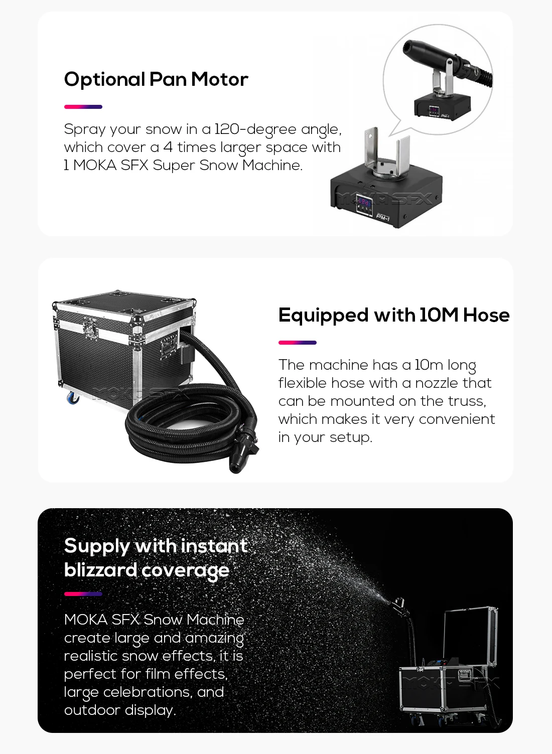 Дополнительный электродвигатель pan доступен для распыления снега под углом 120 градусов, что означает, что вы можете покрыть в 4 раза больше места с помощью 1 MK-S04 суперснегоуборочной машины.
