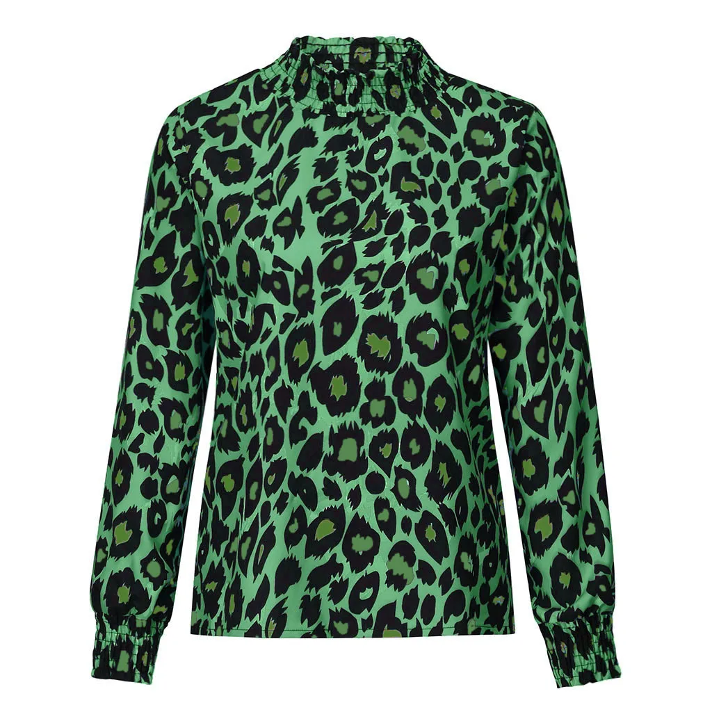 Женская модная блузка с оборками и стоячим воротником с неоновым леопардовым принтом Топ