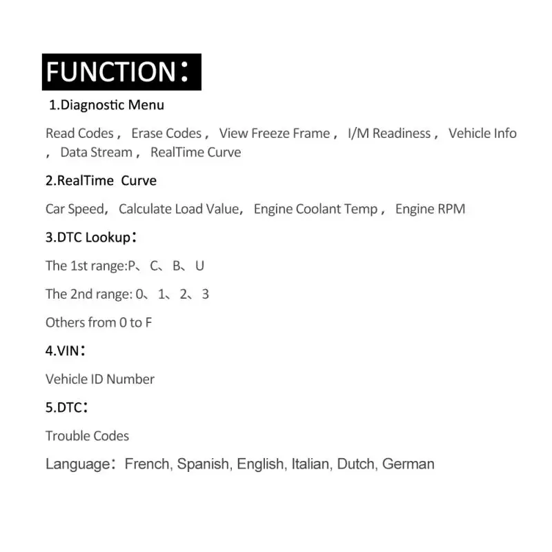 Считывание кодов, стирание кодов, просмотр рамки замораживания, готовность I/M, информация о транспортном средстве, поток данных, кривая реального времени