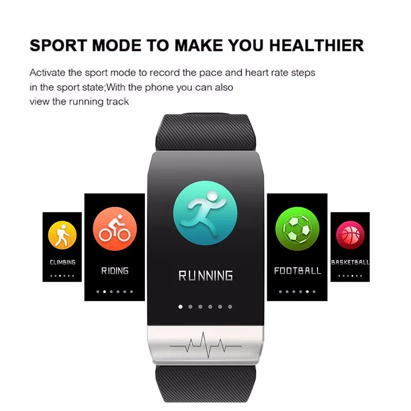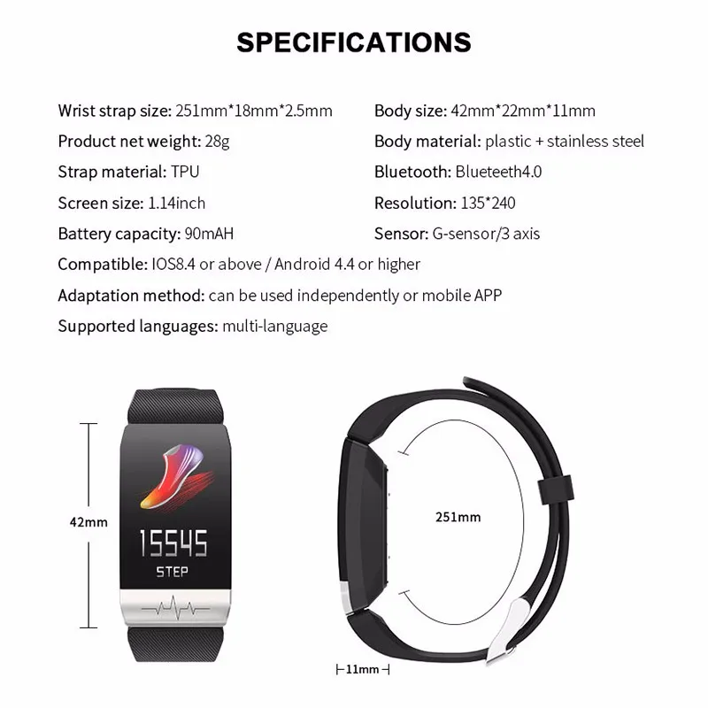 Тип товара: умный Браслет ЭКГ Размер ремешка: 251 мм * 18 мм * 2,5 мм Размер корпуса: 42 мм * 22 мм * 11 мм Размер дисплея: 1,14 дюйма Разрешение 135*240 Сенсорная Форма: одноточечная Ёмкость: 90 мА-ч Верхняя крышка: пластик + нержавеющая сталь Корпус: пластик + нержавеющая сталь Застежка из нержавеющей стали Ремешок: ТПУ Обычный пульс: SC7R30 SRAM: 128kb Флэш-память: 1 м Флэш-память: 8 м G-сенсор: 3 оси Двигатель: SMT цилиндрический двигатель Встроенный: антенна BT Мощность: USB Сенсорный экран: Единая точка Название приложения: Wearfit2.0 Метод зарядки: зарядка через USB Водонепроницаемый Рейтинг: IP67 Версия системы: 4,4 или выше Версия системы: 8,4 или более, Apple 5S и более Базовые навыки: Отображение времени, подсчет шагов, калории, дистанция, спортивный режим, яркий экран, мониторинг сна, беговая дорожка, напоминание о звонках, напоминание о сообщениях, напоминание о сидячем положении, напоминание о тревоге, встряхивание изображения , Найти браслет, переключатель циферблата, погода, циферблат на английском языке, управление музыкой, регулировка яркости экрана , Почасовое измерение, WeChat campaign, частота сердечных сокращений, apple health, health weekly, Bluetooth name, language