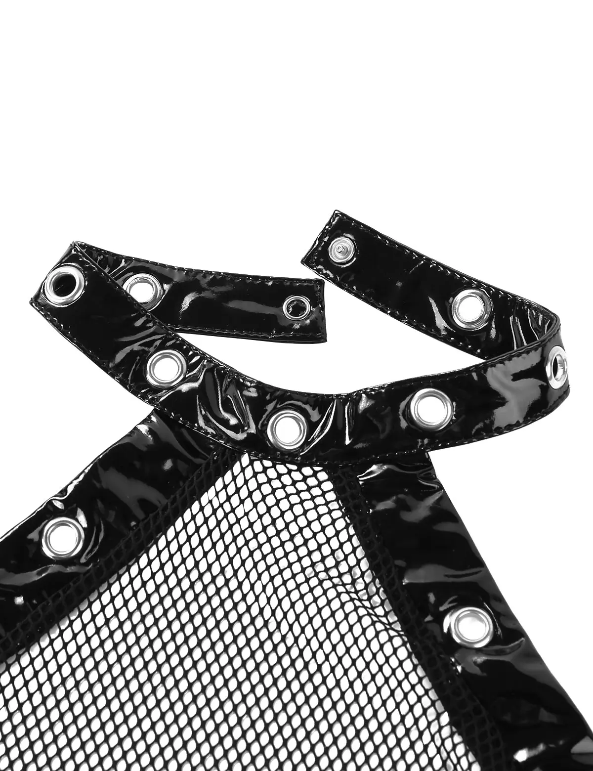 Холтер шеи, без рукавов и спинки, мокрого вида лакированной кожи отделаны круглым кольцом.