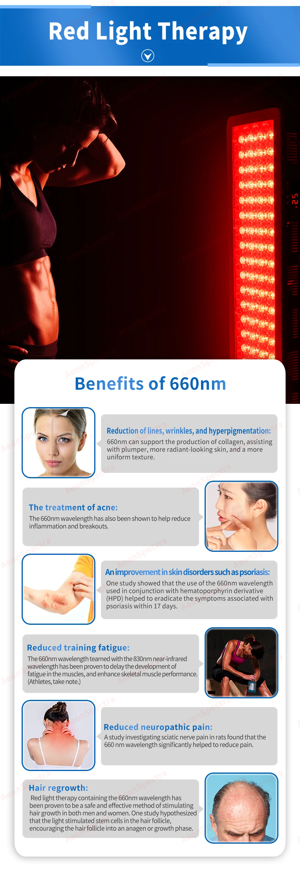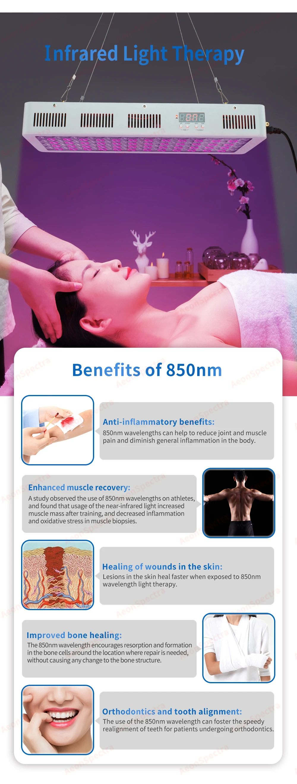 Преимущества различной длины волны: Выберите наиболее биологически длину волны является ключом к оптимизации преимуществ красный светильник и терапия около-Инфракрасный светильник. Красный светильник и длина волны около инфракрасного диапазона признаны за специальные регенеративные и терапевтические результаты, которые дают организму. Длина волны 660нм (красный светильник) Длина волны 660нм проникает глубже, чем длина волны 630нм, длина волны 660нм достигает всего диапазона тканей кожи, что способствует заживлению и регенерации. Преимущества снижения усталости при тренировках, воспаления, отечности следуют за травмами и невропатными болями; Улучшенное заживление костей и ускоренное заживление ран. Длина волны 850 нм (ближний инфракрасный светильник) Ближний инфракрасный светильник длиной волны больше, чем красный светильник длиной волны, от 700нм до 1000нм, который проникает глубже в ткани в клетки тела и может пройти через кость, чтобы помочь с заживлением глубоких ран, мышечные боли, травмы нерва или боли в суставах; Большинство людей выбирают ближний инфракрасный свет для лечения.