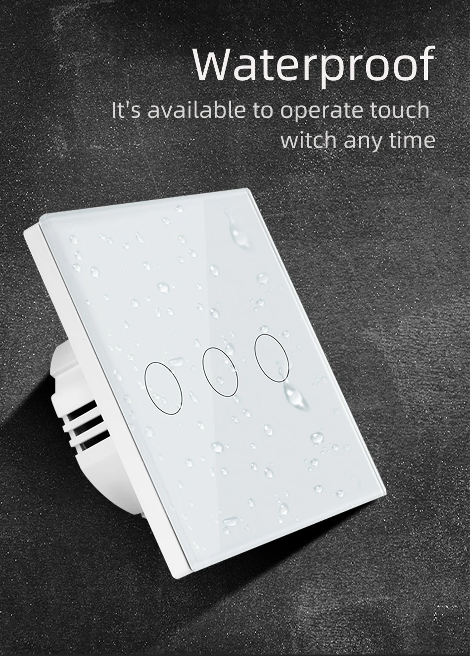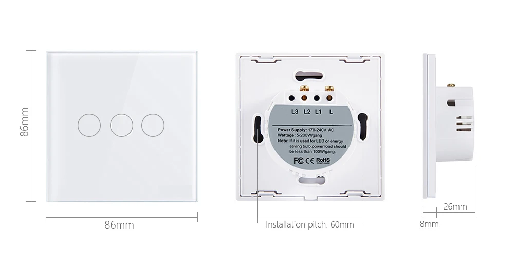 Сенсорный эффект этого продукта такой же, как у емкостного экрана мобильного телефона. Технологические инновации и роскошная панель из закаленного стекла делают поверхность более жесткой и легкой в чистке. Белый эффект-это самый продаваемый продукт, белый и яркий, в основном продается в России и на европейском рынке. Описание товара Бренд: MEKISS Модель: M-TS-03 Количество путей управления: 3 группы Размеры: 86 × 86 × 34 мм Источник питания: 110-240 в 50-60 Гц Сертификация: CE, FCC, RoHS Особенности: 1. Панель из закаленного стекла, твердая поверхность, Пылезащитная, легко моется. 2. Огнеупорный материал. 3. Вы можете прикоснуться к кнопке переключения влажной рукой. 4. Чувствительное касание, сильное касание, емкостный сенсорный эффект. 5. Поверхностный светодиодный светильник, красный (яркий), синий (темный). 6. Один дизайн firewire не нужно открывать переделку стены, прямая замена старого выключателя. Размеры: 86 × 86 × 34 мм