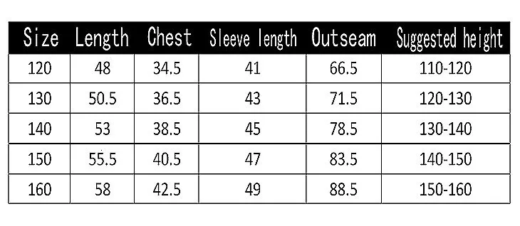 140(suggest height:125-135cm):Top Length:52.5cm/20.7inches,Bust:76cm/29.9inch,Pant:78cm/30.7inches ,Hip:83cm/32.7inches,for kids 6-7Y