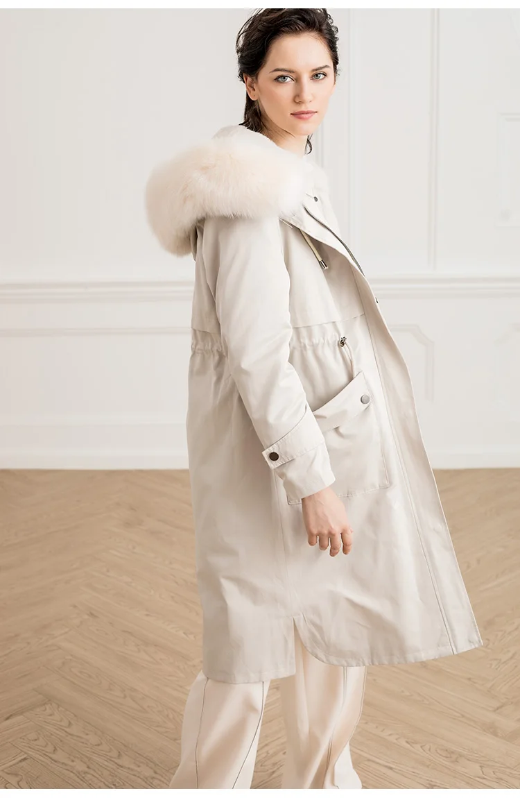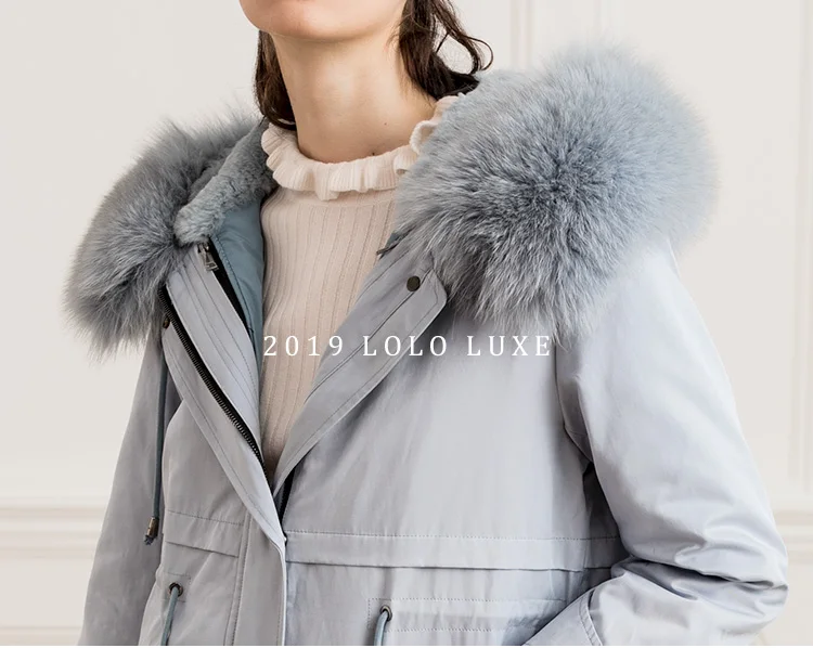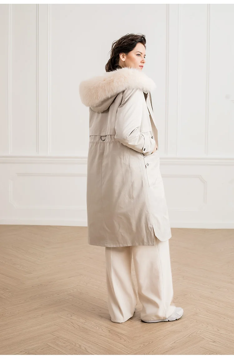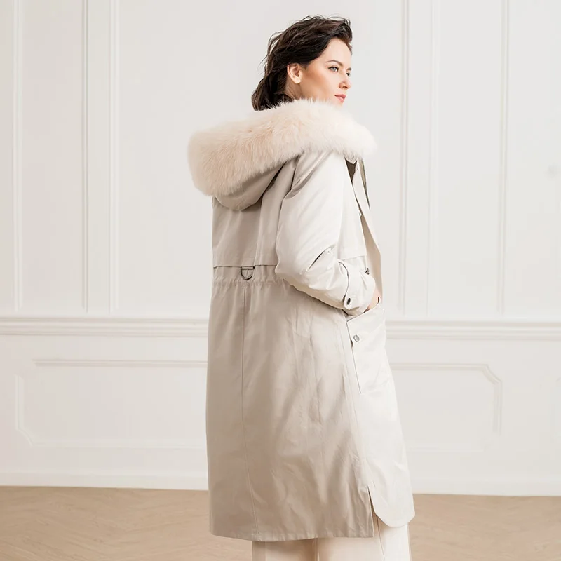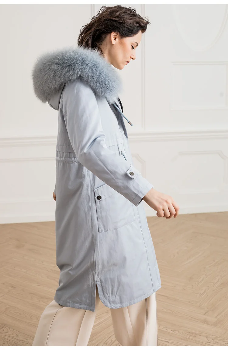 Это пальто-парка доступно в двух цветах. Светильник синего и кремового цвета.