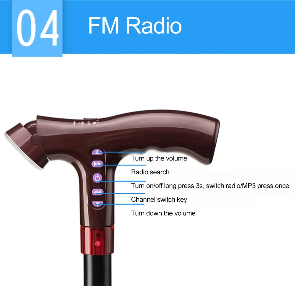 Трость специально разработана для пожилых людей, легкая и прочная, телескопическая и противоскользящая. Что еще более важно, это может автоматически сигнализировать о падении пожилых людей. Также функция fm-радио и MP3 делает жизнь более богатой для пожилых людей.