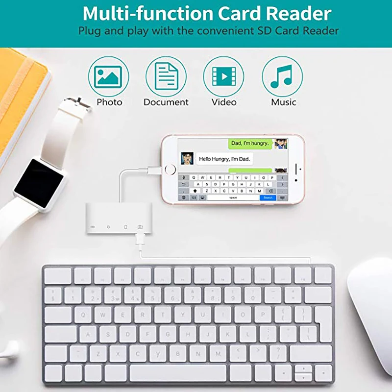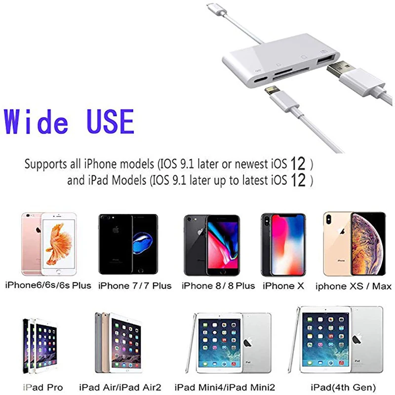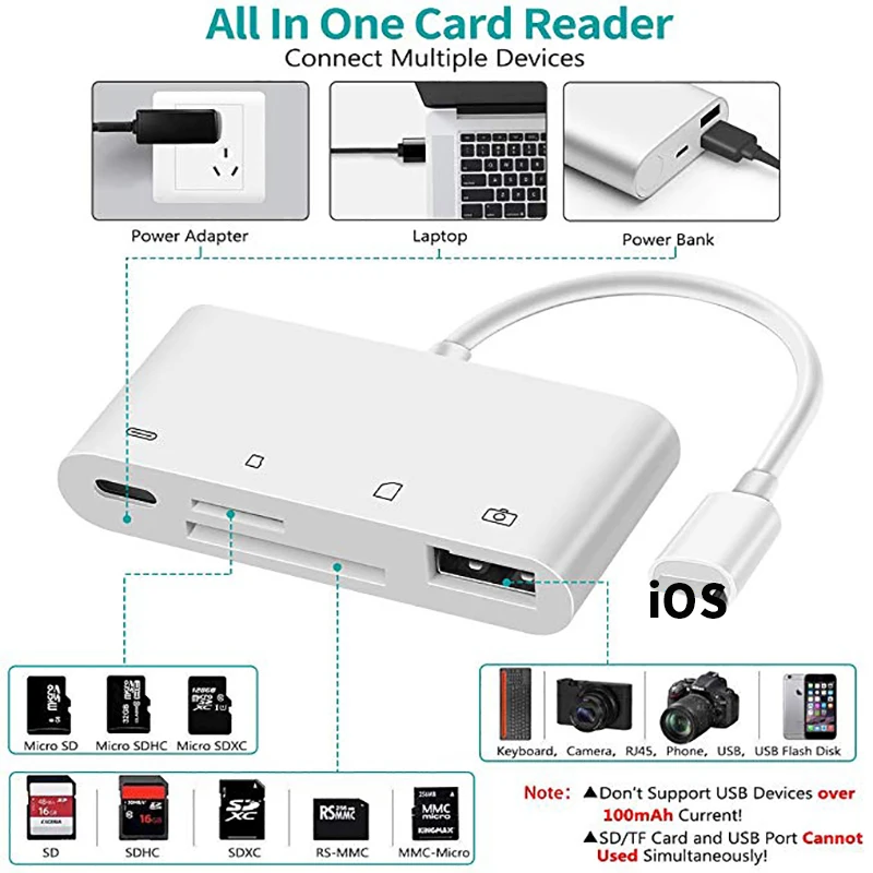 ◆Мульти-функции◆ совместим с iPhone на sd-кард-ридер с 1 * USB 2,0 Женский порт, 1 * sd-карта порт (SD/SDXC/SDHC/RS-MMC/MMC микро-карта), 1 * карта памяти TF/Micro SD (Micro SDXC/Micro SDHC/Micro SD карта), 1 * Женский 8-контактный порт для зарядки ◆Quick передачи данных Speed◆ передачи USB2.0 порте составляет 14 Мб/с ~ 16 МБ/с.. Быстрая загрузка фотографий и видео на iPad/iPhone с помощью устройства для чтения карт памяти SD. Память SD/TF карты поддерживает не менее 1 Гб-максимум 1 ТБ SD/TF карты. Множественный выбор, все зависит от вас ◆Plug & Play ④ Plug & Play. Дополнительное по не требуется. Устройство для чтения sd-карт lightning поддерживает стандартные форматы фотографий, такие как JPEG и RAW и HEIF/HEVC и т. д. Кроме того, он поддерживает вход клавиатуры ПК/концентратор/Адаптеры Ethernet/аудио/MIDI-интерфейс. Пожалуйста, подтвердите, что рабочий ток аксессуара меньше или равен 100 мА, в противном случае устройство всплывет ◆Широкая совместимость и мульти-системы ④ Поддержка нескольких систем iOS 10-12. Не поддерживает iOS13. iPhone 5/5c/5S/6/6 Plus/6s/6s Плюс/SE/7/7 Plus/8/8 plus/X/XR/Xs макс, iPad mini/mini 2/Air/Air2/mini3/mini 4/Pro. Порты USB поддерживают только периферийные устройства, которые потребляют менее 100 мА ◆Теплые tips④ обратите внимание: рабочий ток аксессуара меньше или равен 100 мА, в противном случае устройство всплывет. Кроме порта для зарядки, другие порты можно выбрать только один из них при подключении внешнего устройства. Если USB флэш-диск/Micro SD/SD карта непосредственно используется с этим набором, необходимо создать "DCIM" Папка и копировать