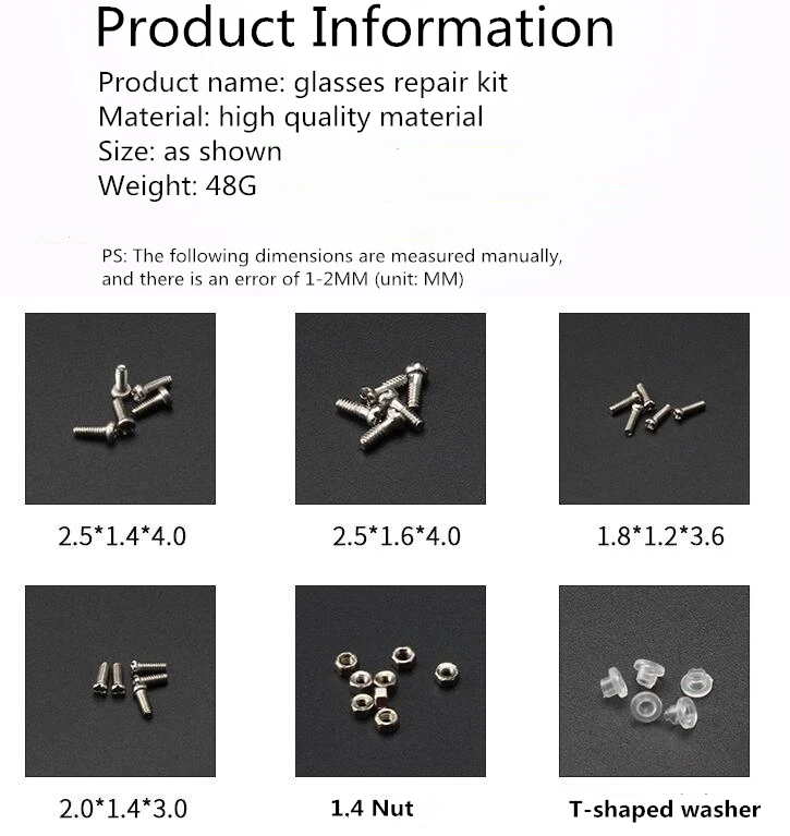 Название продукта: Набор для ремонта очков Материал: материал высокого качества Материал Размер: как показано Вес: 48 г Характеристики: отобранные материалы, компактные и удобные для переноски PS: следующие размеры измеряются вручную, и Есть погрешность в 1-2 мм (единица измерения: мм)