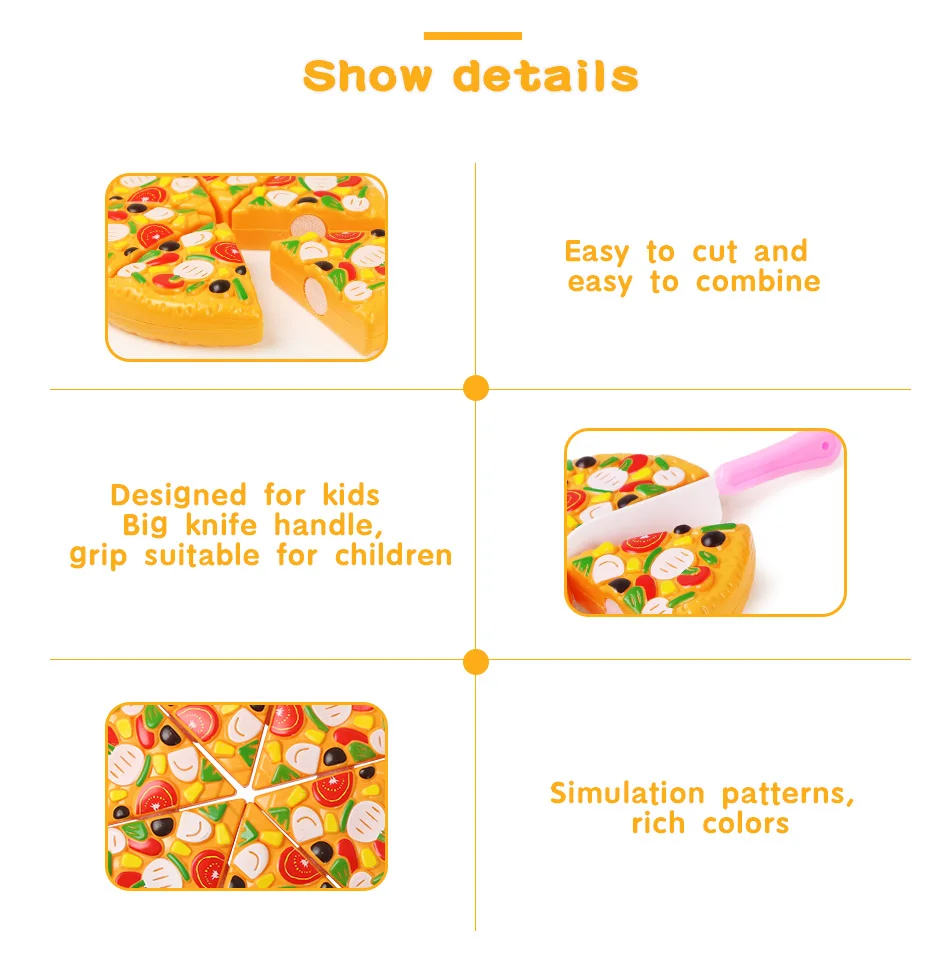 -Похоже на настоящую пиццу, дает детям реальное восприятие пищи. -Играйте с друзьями или семьей, развивайте способность делиться детьми. -Богатые цвета, привлекательные для детей и развивают их познание цвета. -Безопасный материал, не повредит детскую кожу. -Свободно собирайте, тренируйте воображение детей. -Способствует интеллектуальному развитию, умственному мышлению, тренингу по интересам, взаимодействию родителей и детей, эмоциональному взаимодействию, захвату, сенсорной, зрительно-моторной координации и развитию других способностей.
