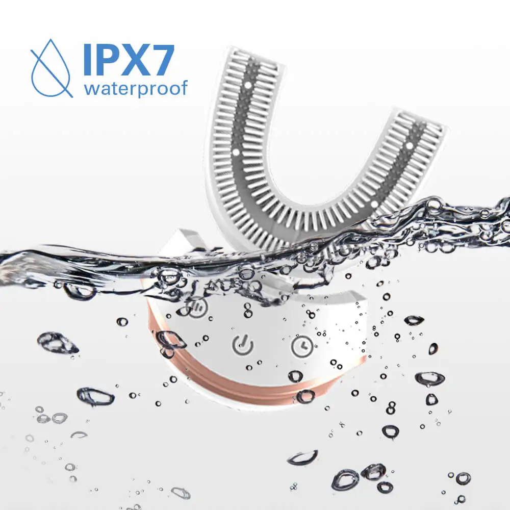 7. Водонепроницаемость IPX7: Бесшовный корпус, Индуктивная зарядка, лучший водонепроницаемый эффект. Выдерживает очистку потока воды, однако для более длительного срока службы и безопасности этой электрической зубной щетки рекомендуется не заваривать в воде длительное время.