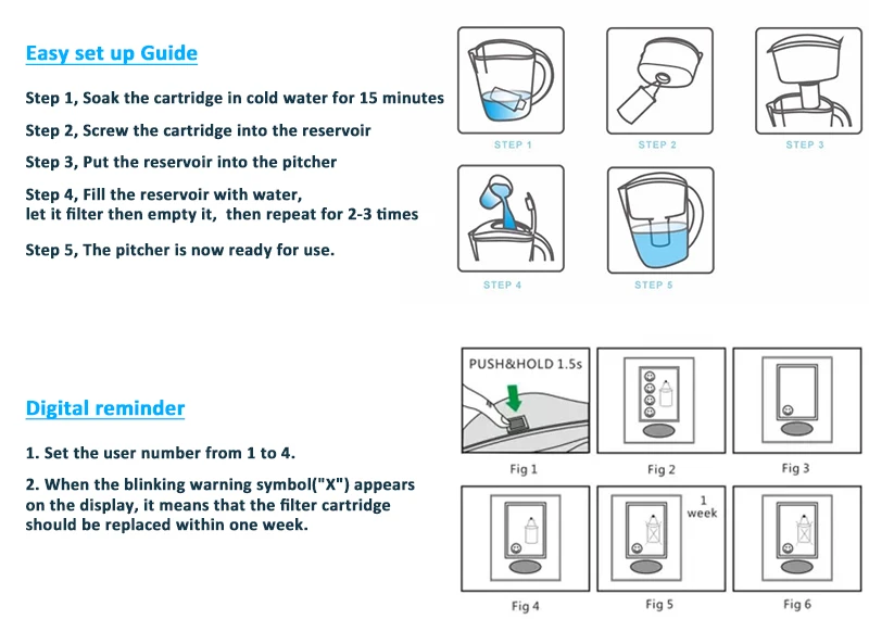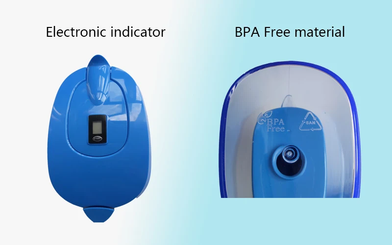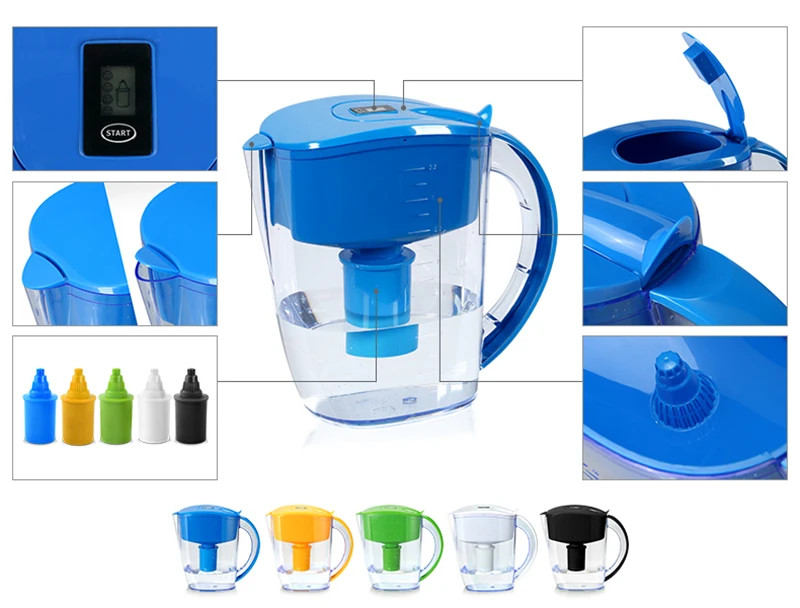1. Материал корпуса: Как 2. Материал крышки и ручки: ABS 3. Материал корпуса картриджа: PP 4. Внутренний материал: активный углерод, ионообменная смола, ОРП шарики, магниевые шарики 5. Емкость кувшина: 3,5л, емкость фильтрации: 2л 6. Умный Цифровой индикатор напомнит вам о необходимости вовремя заменить картридж 7. Гуманный дизайн делает удобство использования 8. Легко заменяемый картридж с помощью завинчивания 9. Модный дизайн для внутренней двери холодильника 10. Низкое отрицание ORP = от-100 до-300 мВ 11. Значение pH = 8-10 в зависимости от качества местной воды 12. Размер продукта = 270 мм (В) * 135 мм (Ш) 13. Вес кувшина (с 1 фильтром) = 800 г, 3 дополнительных фильтра = 500 г 14. Срок службы фильтра = фильтр 250-300 литров воды в зависимости от качества воды