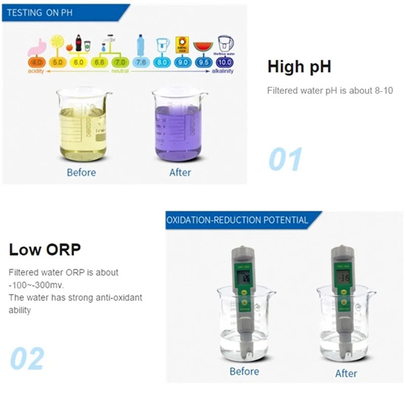 1. Создает шелковисто-гладкую и отличную воду для дегустации, которая идеально подходит для прямого питья и приготовления пищи 2. Помогает фильтровать хлор и другие загрязнители и постоянно поглощает металлы, такие как свинец и медь 3. Поднимает воду до высокой щелочной (pH баланс) pH 8 или выше 4. Природные богатые минералы (Ca, Mg, Na, K и многое другое) в воду 5. Уменьшает масштаб извести 6. Поддержка системного pH баланса в организме 7. Увеличивает активный водород 8. Обеспечивает низкий уровень отрицательного ОРП: от-100 мВ до-300 мВ, что уменьшает окисление вашего тела и делает вас моложе 9. Уменьшает размер молекулы воды, которые создают очень впитываемую воду 10. Увеличивает Щелочность, чтобы сделать вашу питьевую воду более важной