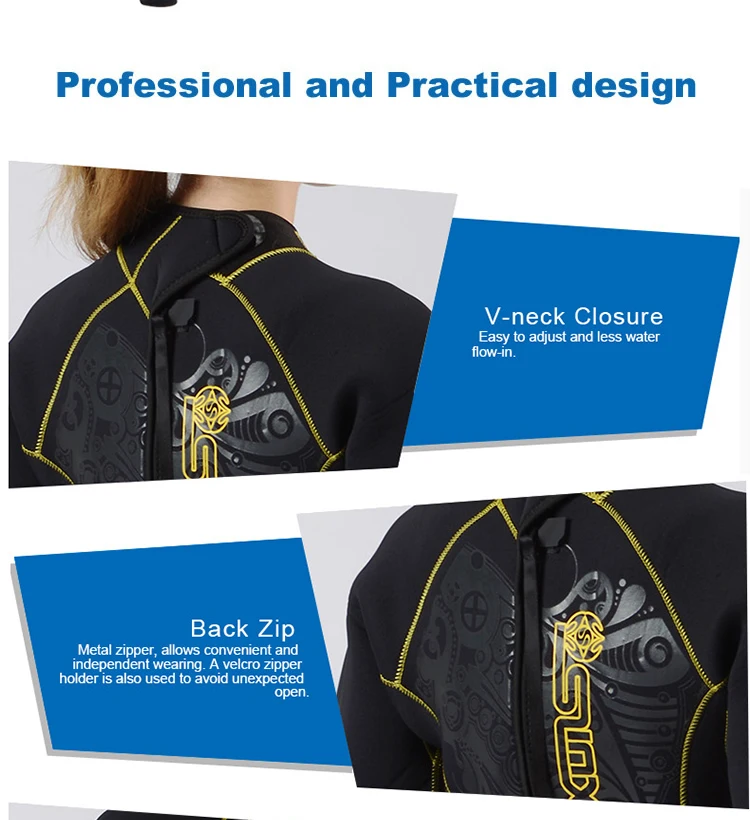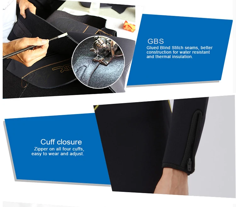 -Склеенные и сшитые на глаза швы (GBS, дополнительно для неопрена 5 мм): тройной склеенный и слепой шов, который уменьшает попадание воды, чтобы держать вас теплее.