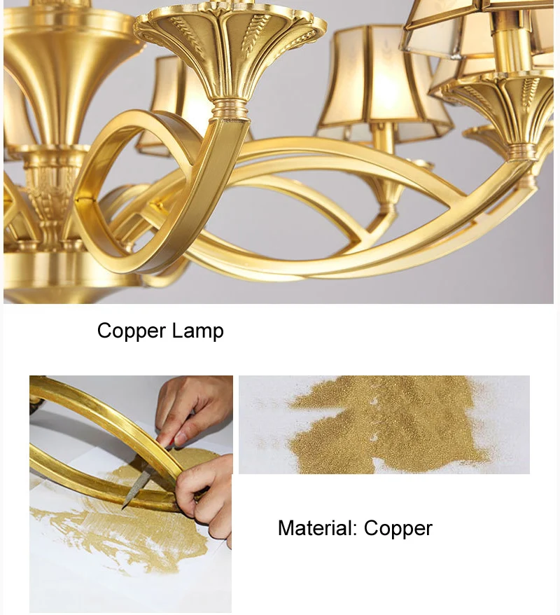 Описание продукта: Люстра светильник Технические характеристики Материал: медная лампа + стеклянный оттенок Лампа: E14 Размер; См. Изображение ниже Мощность: см. Изображение ниже Напряжение; AC 90-265 в Подходящая площадь: 5-60 квадратных метров. Пожалуйста, свяжитесь с нами, если у вас есть какие-либо вопросы во время установки.