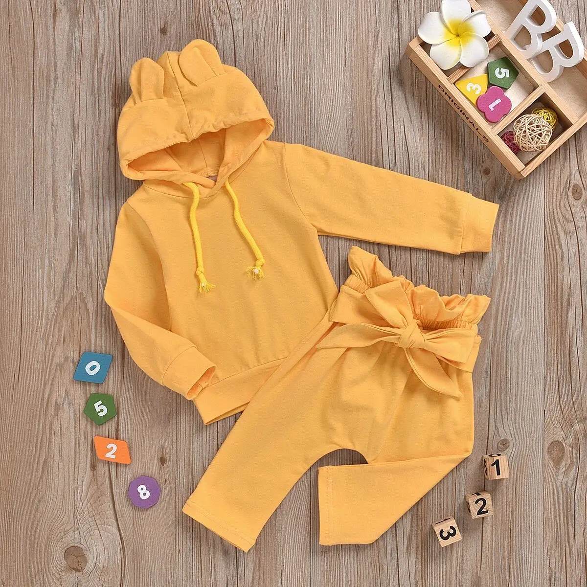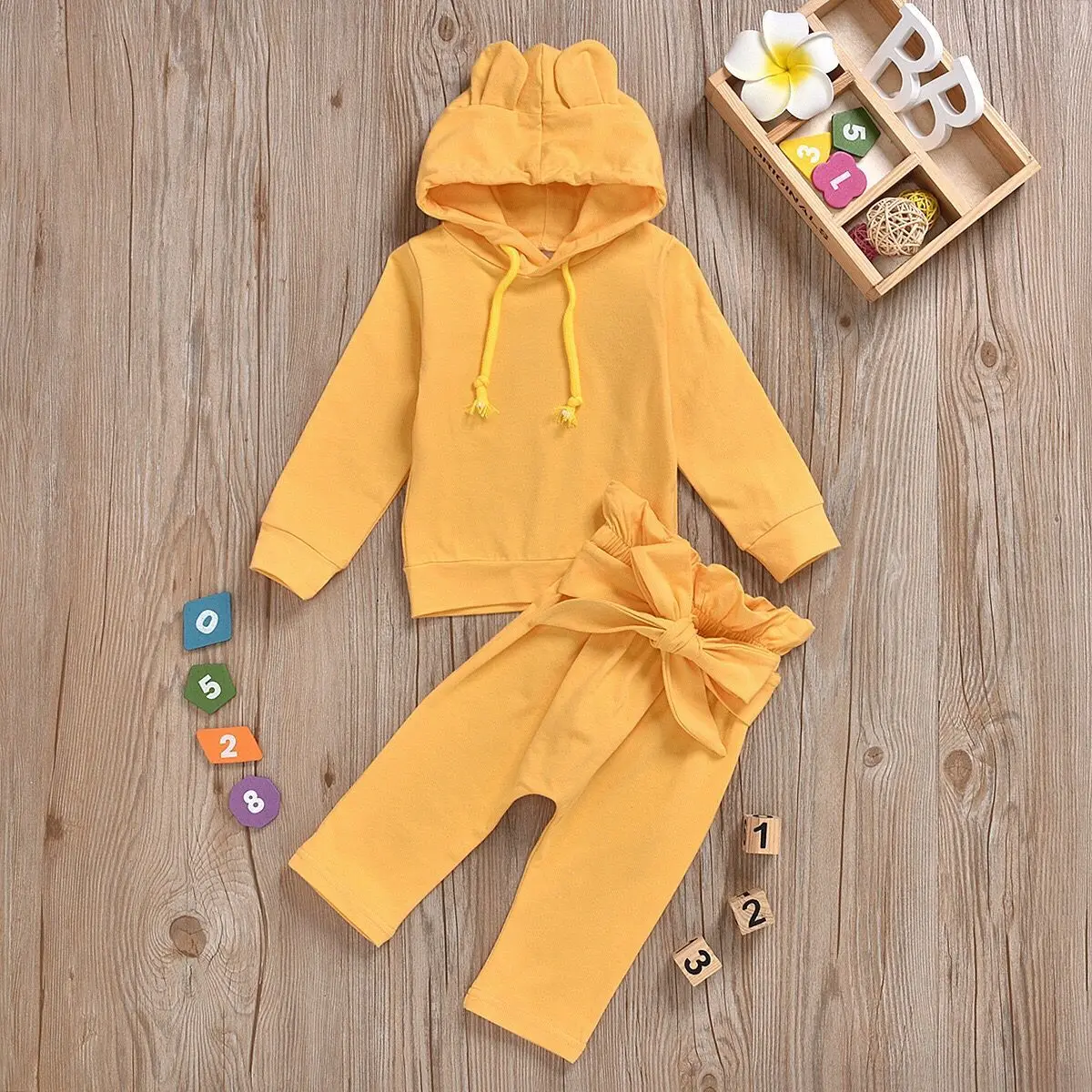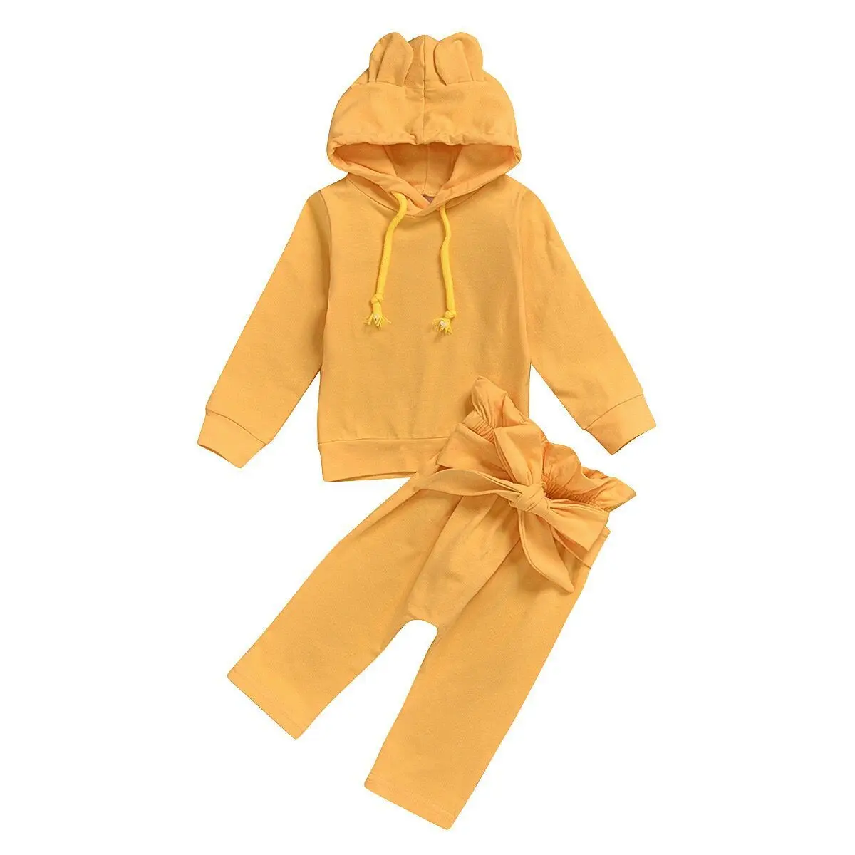 Новинка 2020 года, 2 шт./лот, хлопковая однотонная одежда с ушами для маленьких девочек топ с капюшоном + длинные штаны От 0 месяцев до 3 лет одежды для маленьких девочек