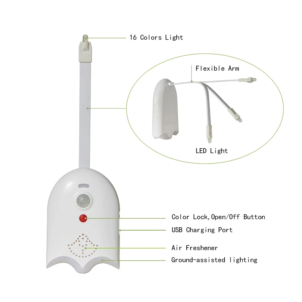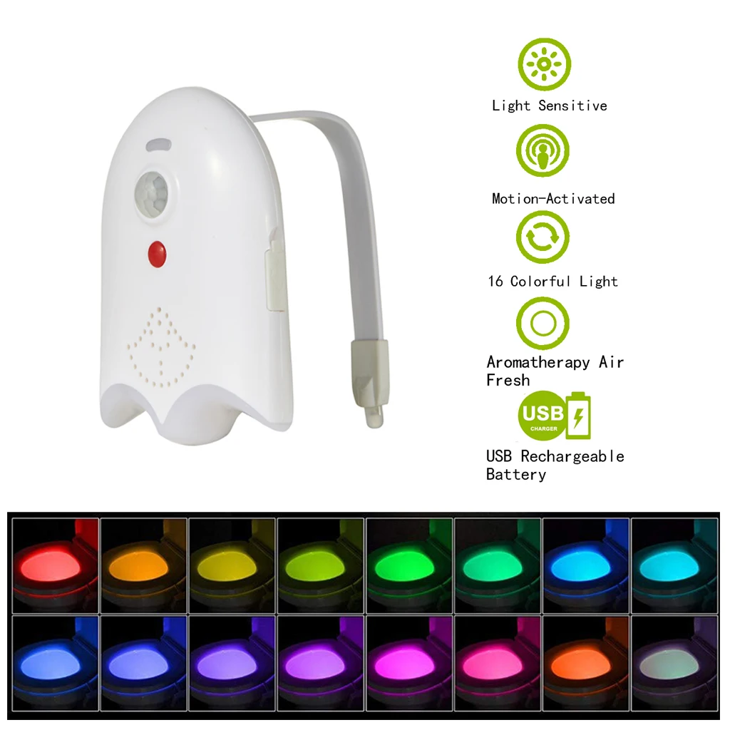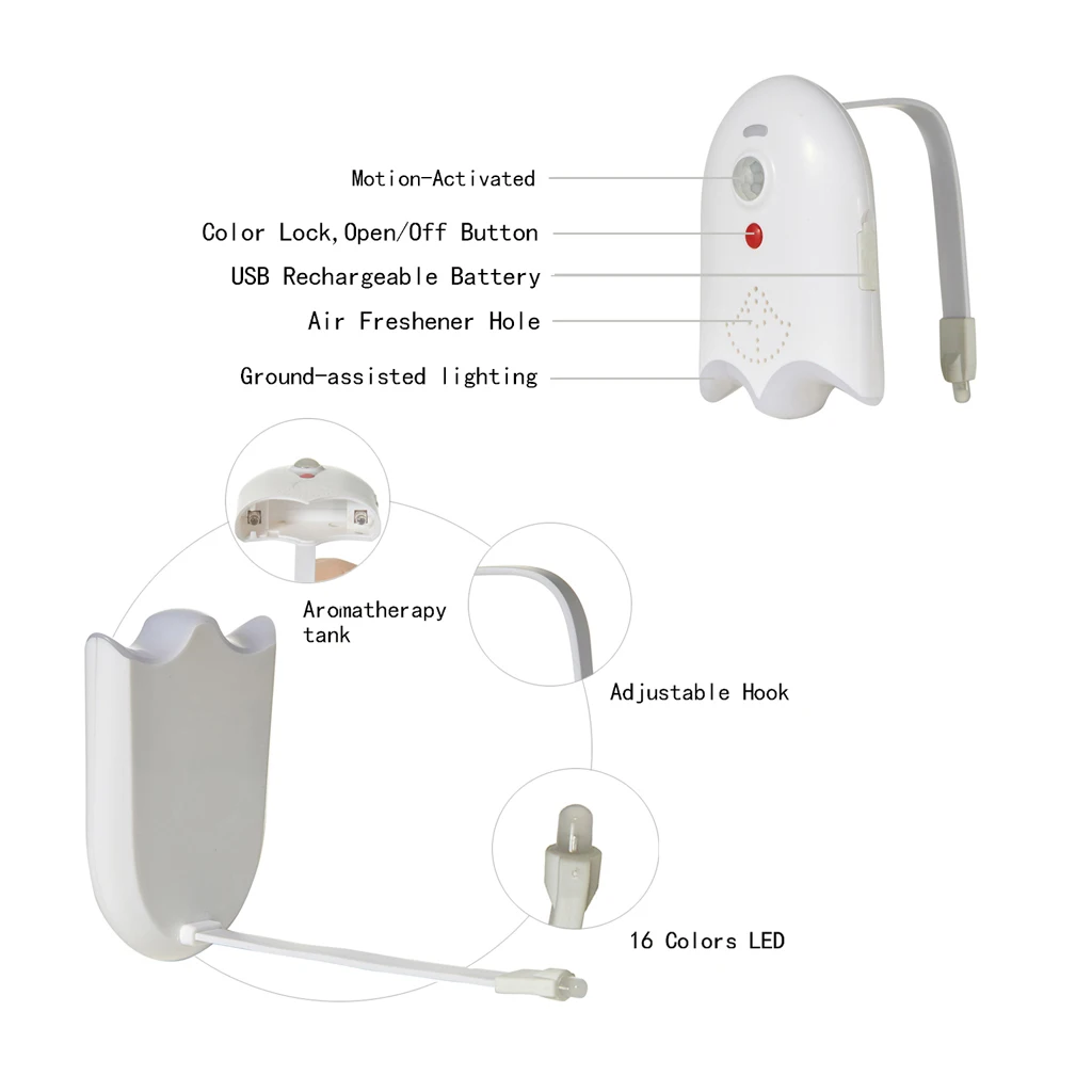Особенности: Подходит для любого туалета! Больше не спотыкаясь в темноте! Нет более грязной чистки! Когда вы подходите к туалету в темноте, он автоматически открывается и выключается после того, как вы выходите. Настройка цвета вращения (16 цветов, 120 секунд) и кнопки также могут восстановить цвет. Фоточувствительные датчики и инфракрасные датчики человека излучают светильник, когда он прибывает в ночное время (в условиях относительно светильник). Легко установить, просто используйте гибкую руку, чтобы положить лампу на сторону унитаза, без наклеек, легко разобрать и собрать. Тип зарядки, с функцией ароматерапии, с ароматерапевтическим листом, водонепроницаемый, передний с лампой. Технические характеристики: Перезаряжаемый светодиодный туалетный светильник 16 цветов Стиль: современный Светильник источник света: светодиодный Светильник 16 цветов Материал Состав: АБС-пластик Напряжение: 4,5 V Батарея: литиевая батарея 500 мАч Мощность: 1 Вт Специальная функция: датчик движения Источник питания: 5 В USB зарядка Размер: 9*6,5 см/3,54*2,56" Время зарядки: 2 часа Время работы: если он подключается десять раз в день, вы можете использовать его более двух месяцев. Один цикл лампы заключается в том, что до тех пор, пока кто-то находится в цикле, расстояние срабатывания составляет 2 метра. Упаковочный лист: 1 * перезаряжаемый туалетный светильник 1 * ароматерапия таблетки 1 * кабель для зарядки 1 * Руководство по эксплуатации на английском языке